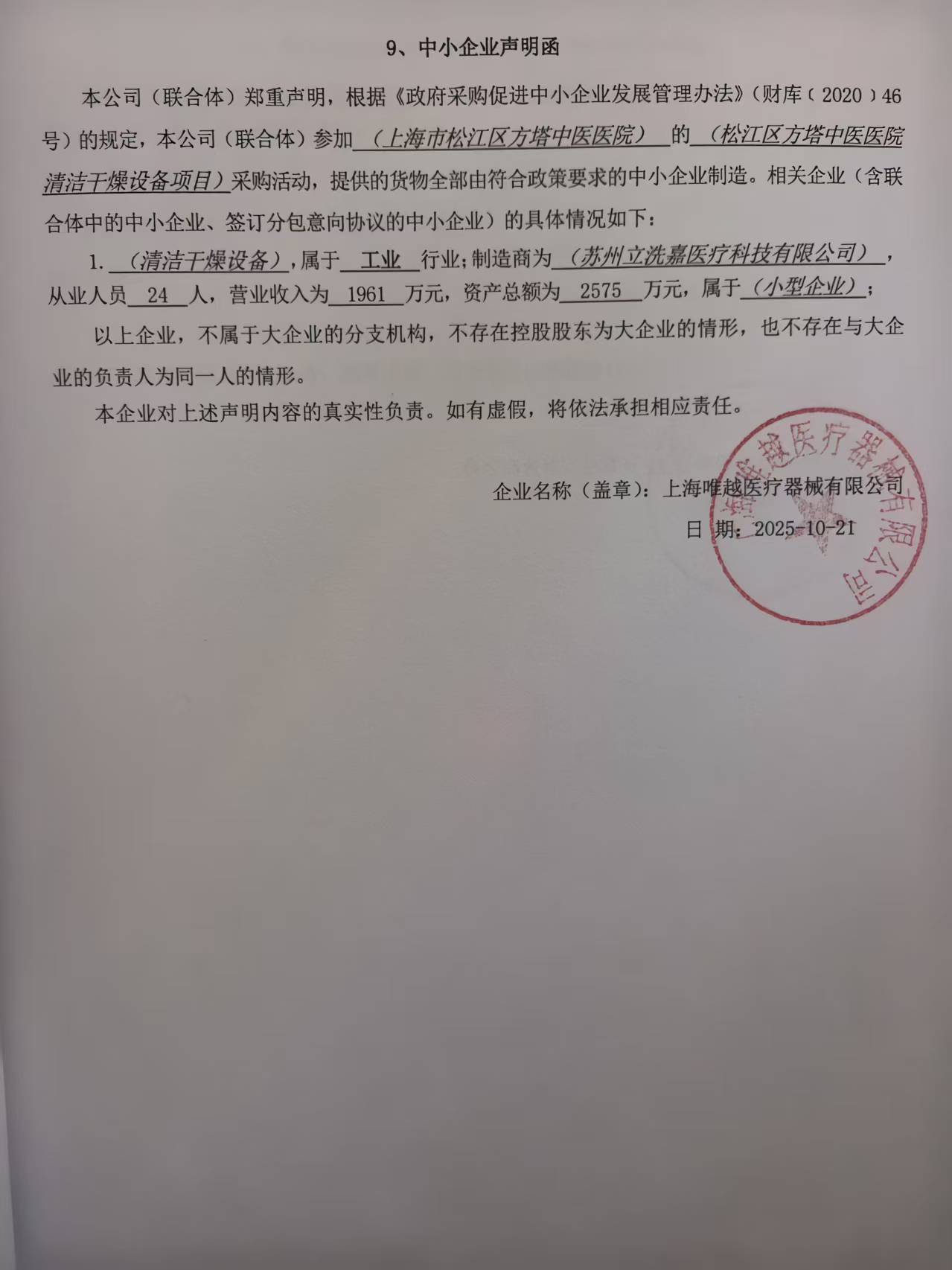 *****;*****;松江区方塔中医医院清洁干燥设备采购项目,质保期:自验收合格之日起**个月。