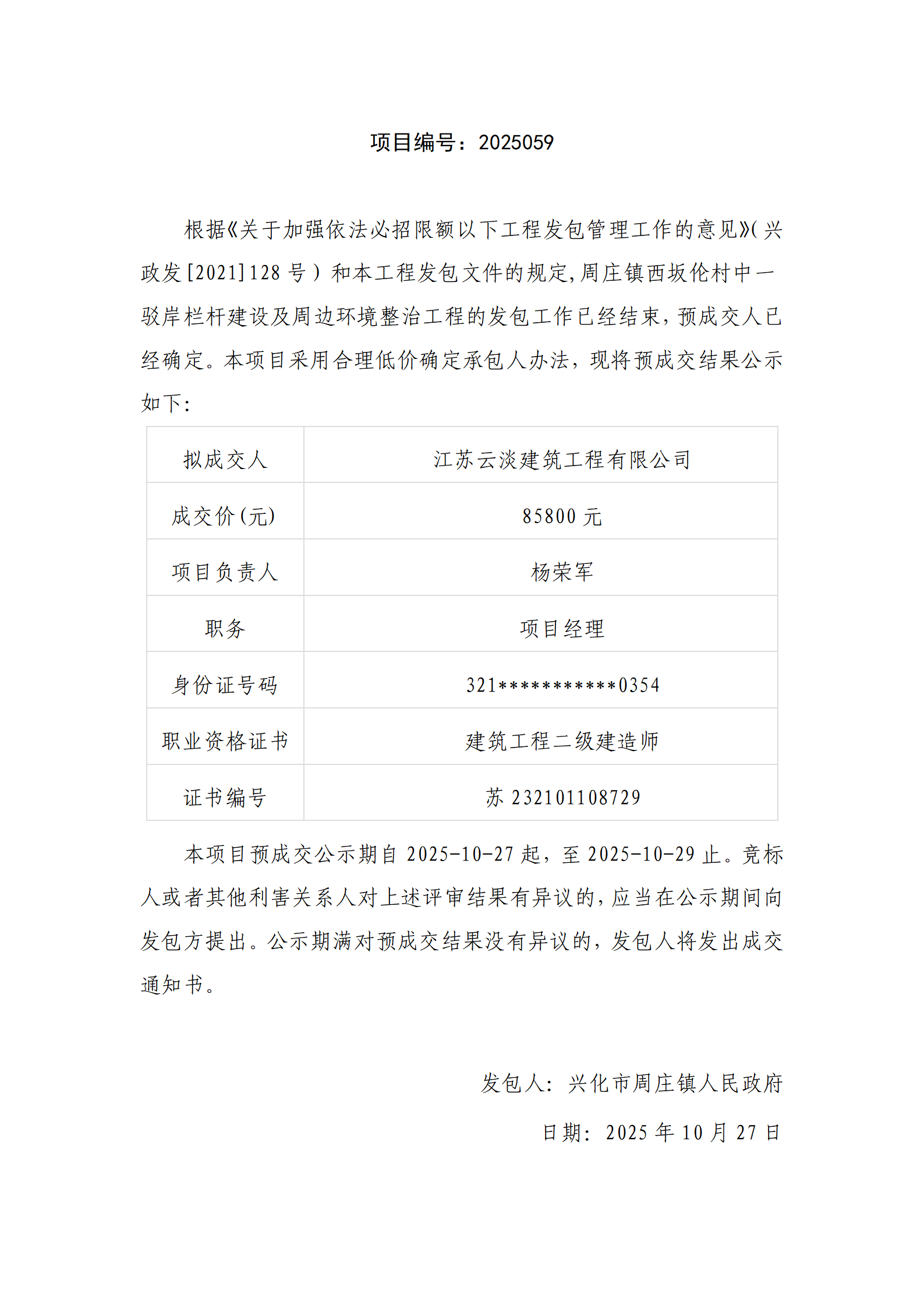 镇西坂伦村中一驳岸栏杆建设及周边环境整治工程预成交公示