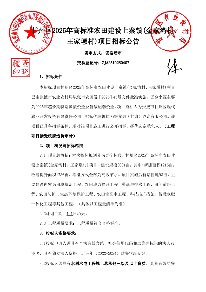 甘州区2025年高标准农田建设上秦镇(金家湾村、王家墩村)项目招标/资审公告