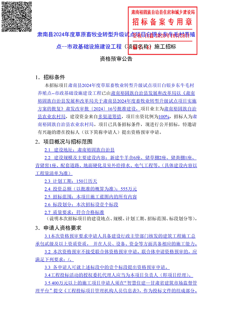 肃南县2024年度草原畜牧业转型升级试点项目白银乡东牛毛村养殖点--市政基础设施建设工程招标/资审公告
