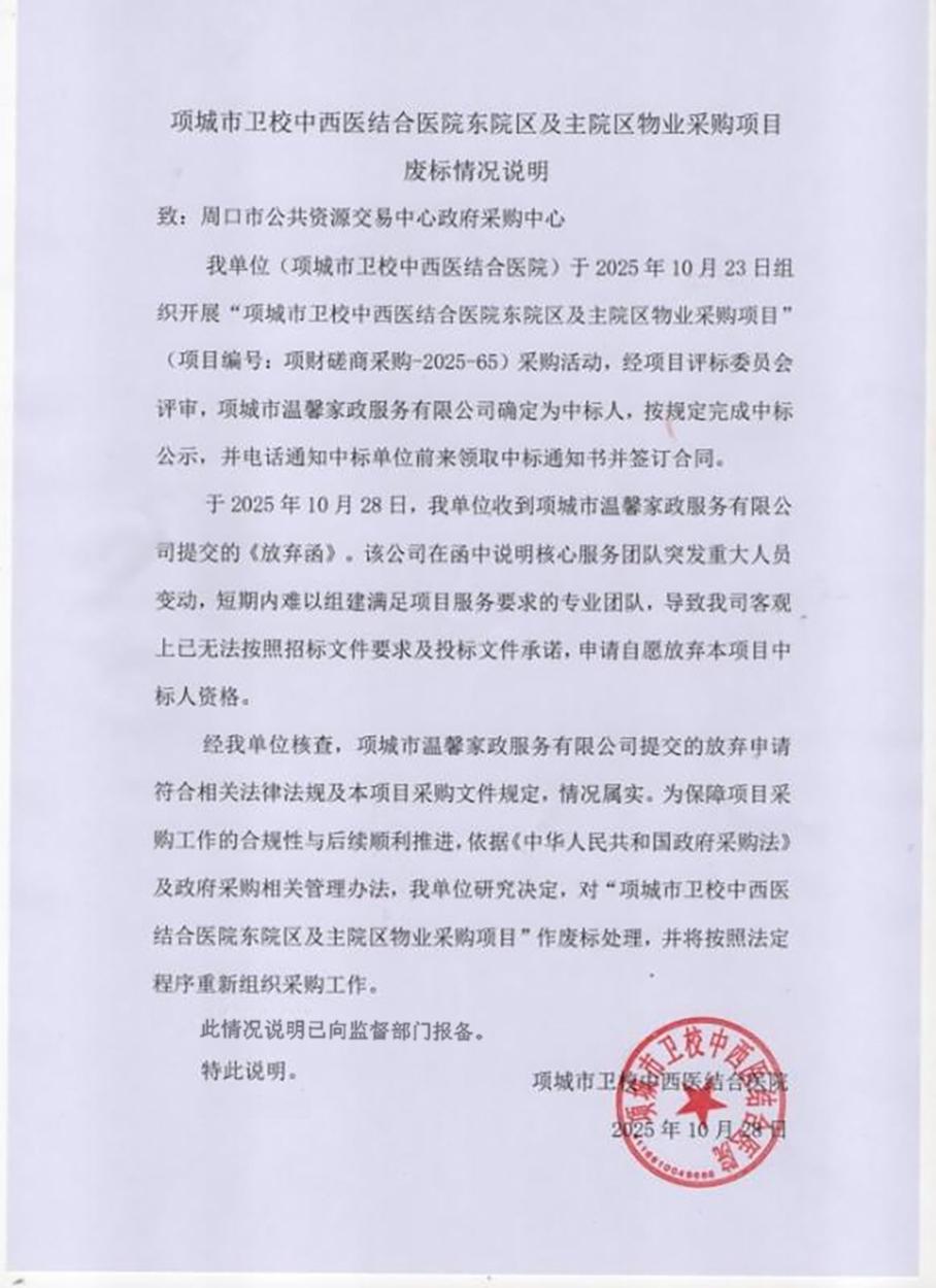 项城市卫校中西医结合医院东院区及主院区物业采购项目-废标(终止)公告