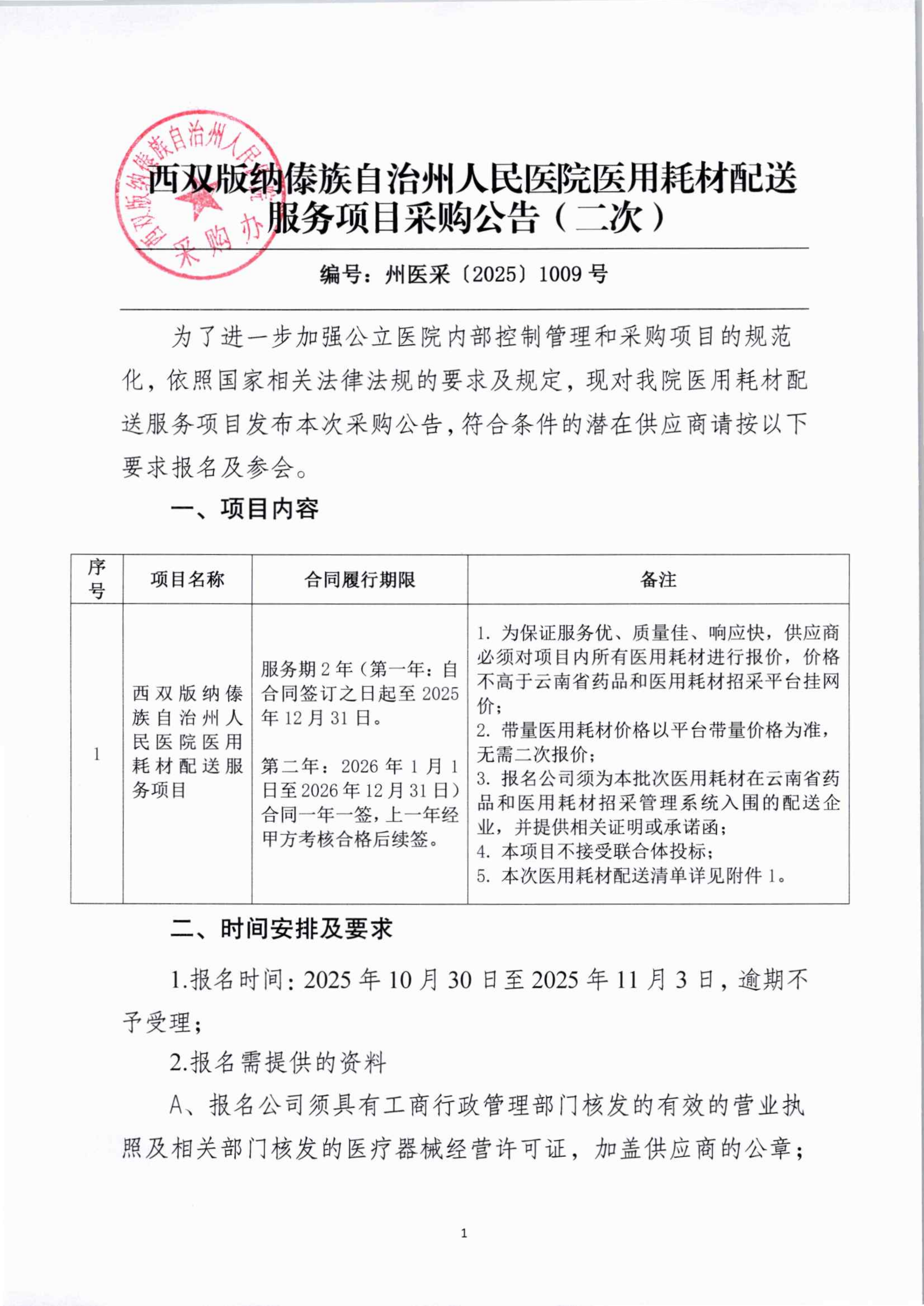西双版纳傣族自治州人民医院医用耗材配送服务项目采购公告(二次)