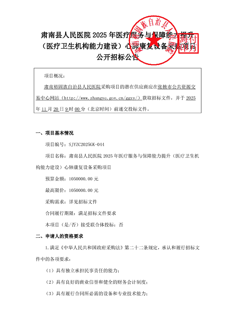 肃南县人民医院2025年医疗服务与保障能力提升(医疗卫生机构能力建设)心肺康复设备采购项目公开招标公