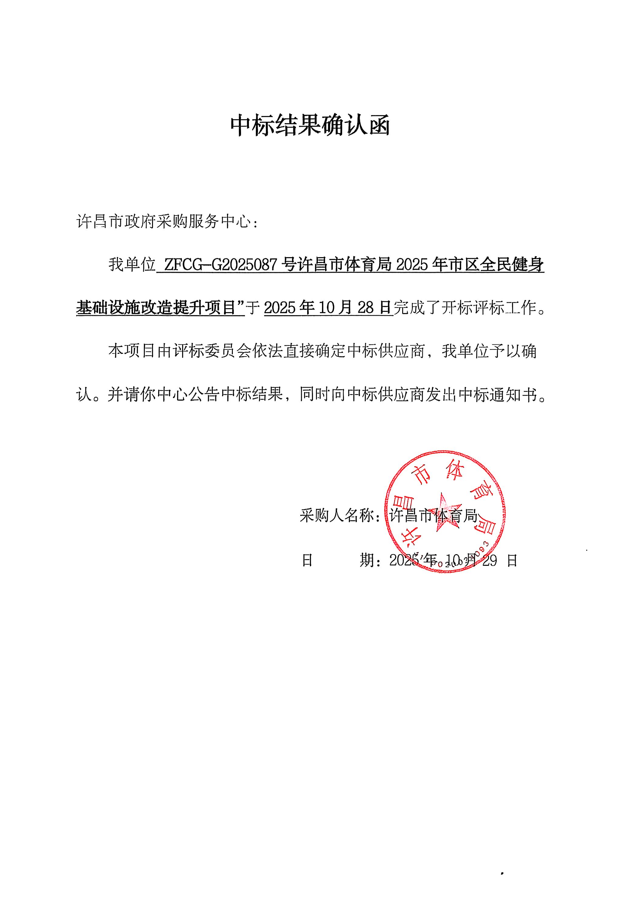ZFCG-G2025087号许昌市体育局“许昌市体育局2025年市区全民健身基础设施改造提升项目”-中标公告
