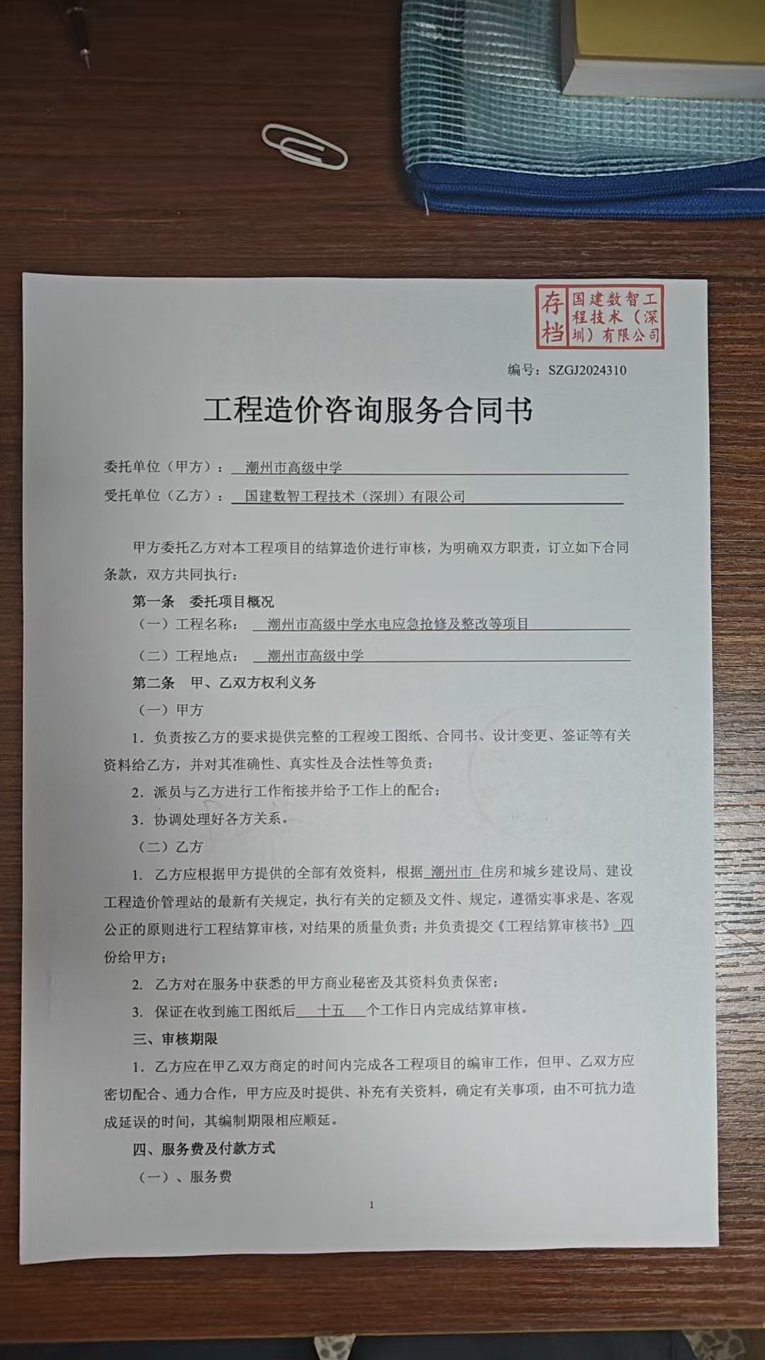 潮州市高级中学水电应急抢修及整改等项目--结算审核合同公开