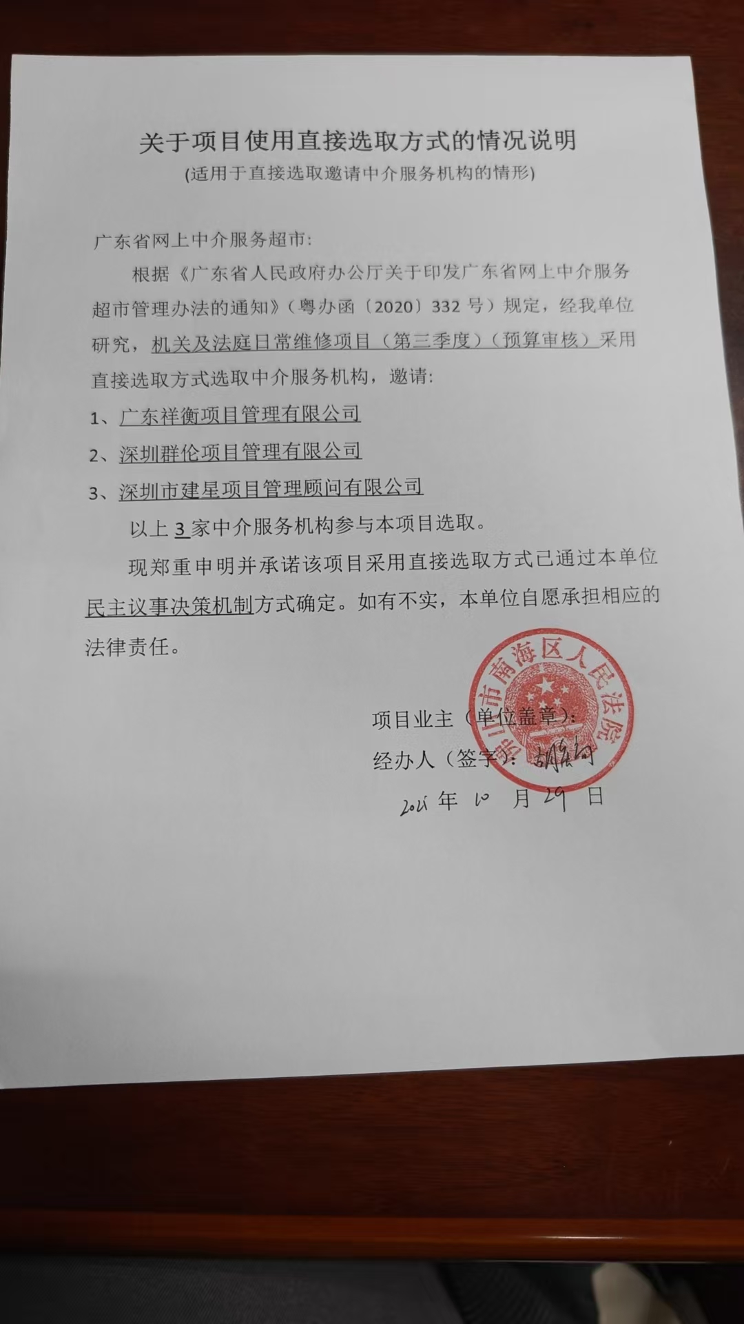 ********** **:** ,在广东省网上中介服务超市为佛山市南海区人民法院 公开选取工程造价咨询中介服务机构,现将相关事项公告如下: