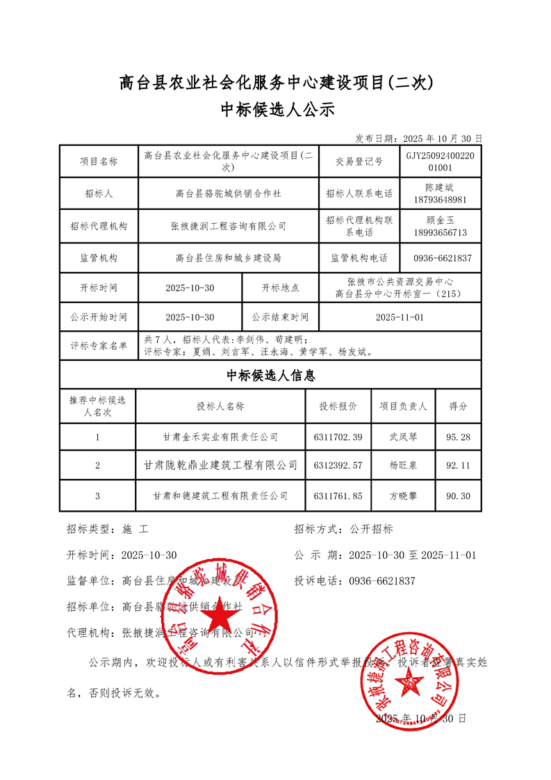 [高台县]高台县农业社会化服务中心建设项目(二次)中标候选人公示