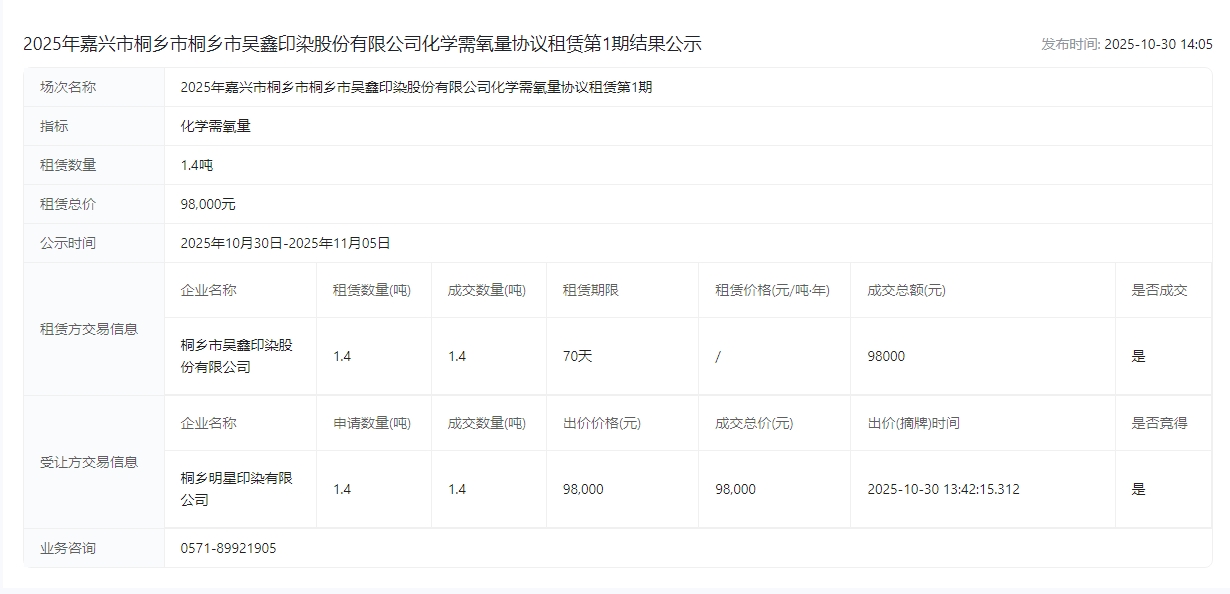 吴鑫印染股份有限公司化学需氧量协议租赁第1期结果公示