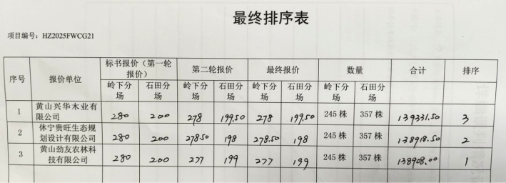 中标(成交)金额:石田分场***元/株;岭下分场***元/株。
