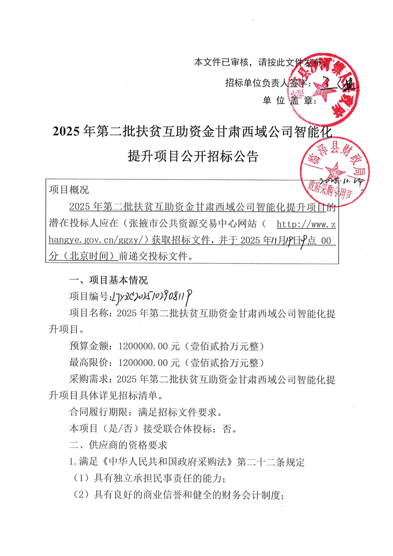 2025年第二批扶贫互助资金甘肃西域公司智能化提升项目招标公告{type}
