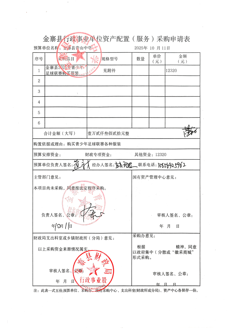 金寨县青山中学事业单位资产配置(服务)采购:青少年足球联赛服装采购