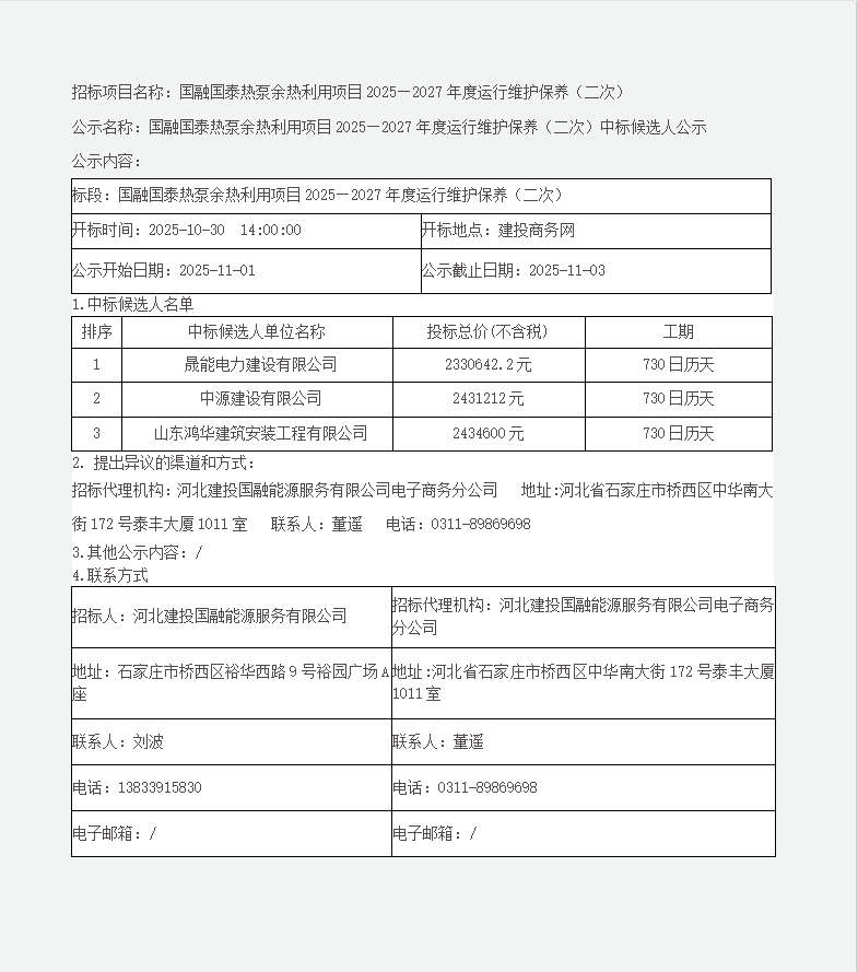 【正常】国融国泰热泵余热利用项目2025—2027年度运行维护保养(二次)中标候选人公示