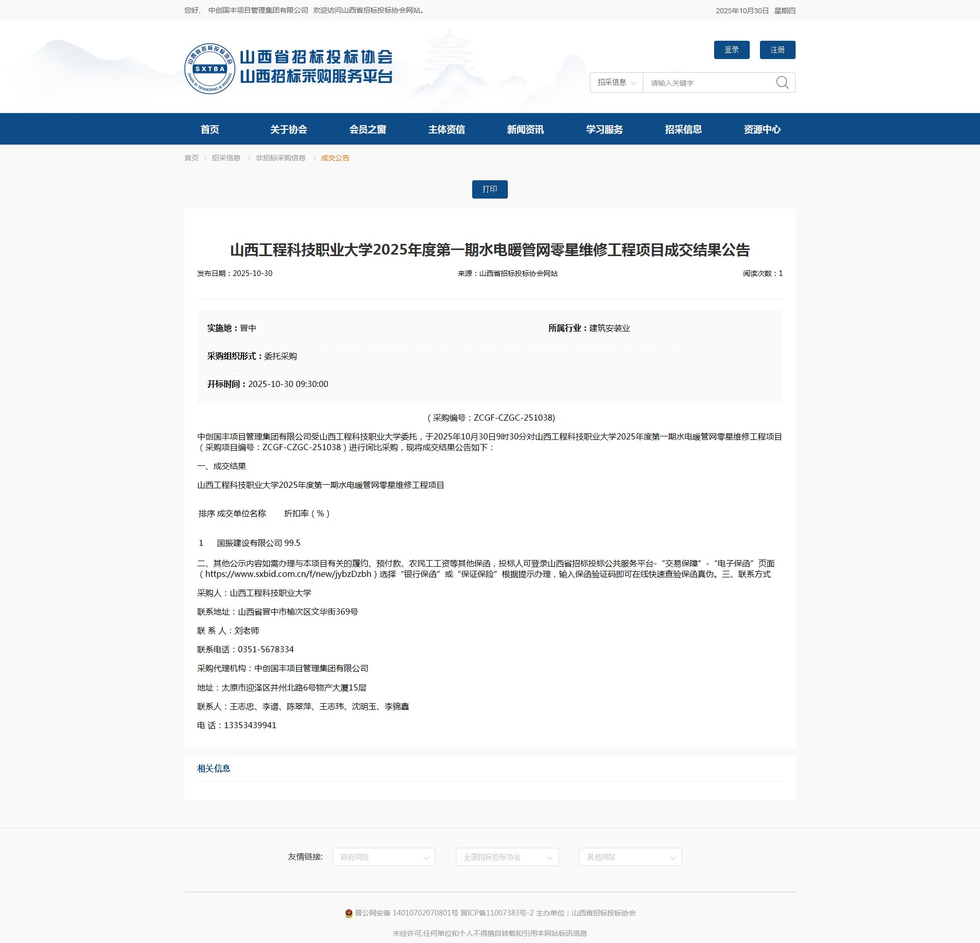 山西工程科技职业大学2025年度第一期水电暖管网零星维修工程项目成交结果公告