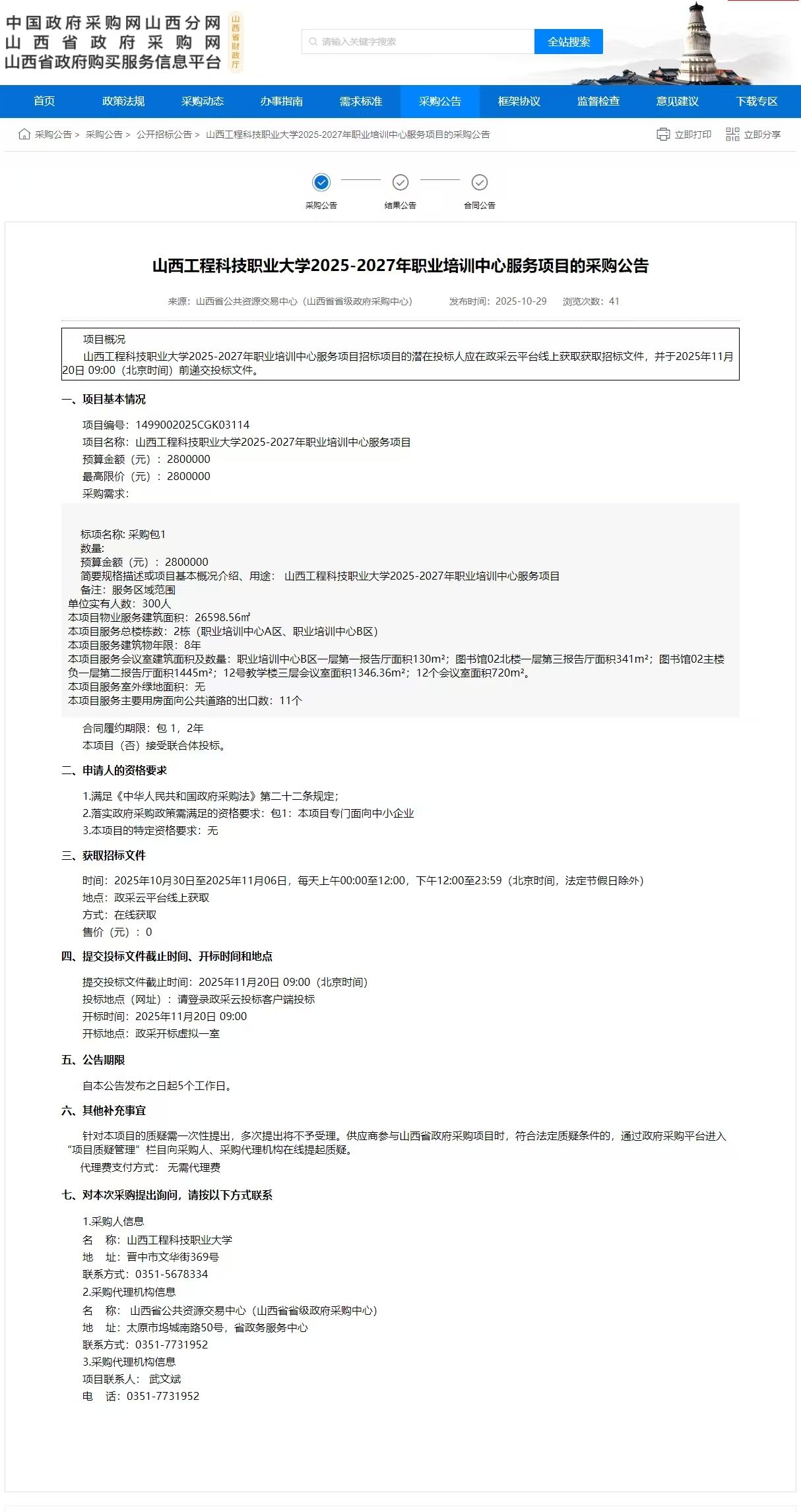 山西工程科技职业大学2025-2027年职业培训中心服务项目的采购公告