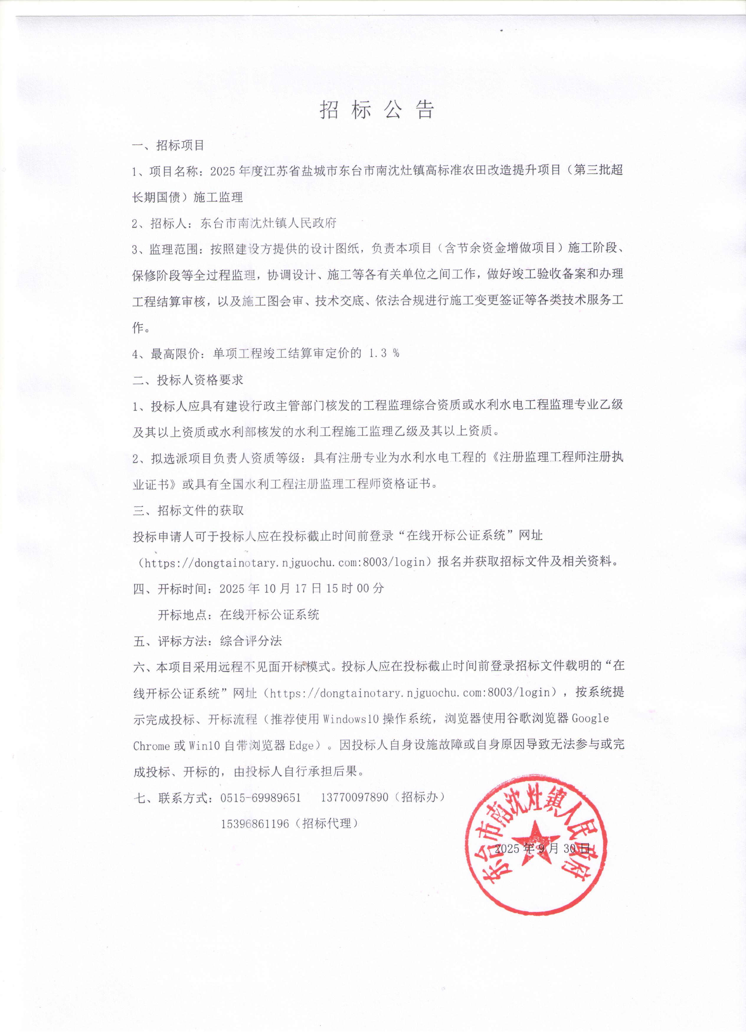 市南沈灶高标准农田改造提升项目施工监理招标公告