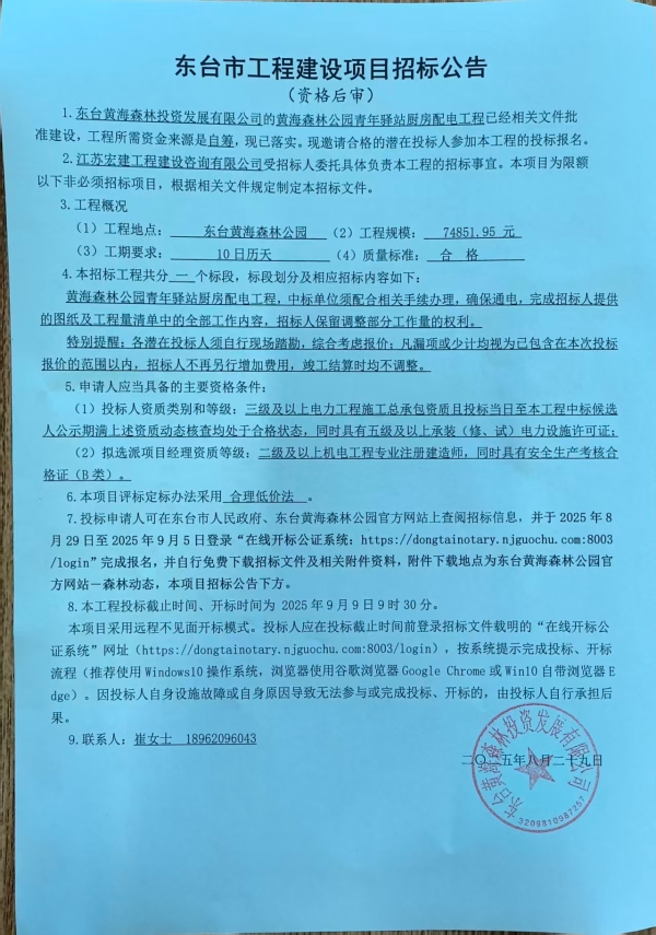 黄海森林公园青年驿站厨房配电工程招标公告