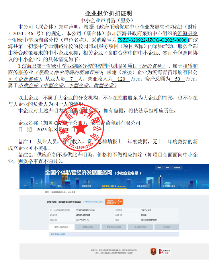名称:滨海县第一初级中学西湖路分校的校园印刷服务项目 服务范围:承担滨海县第一初级中学西湖路分校的行政管理、教育、教学、教科研、创建等所需的打印、复印、租赁打印设备、人员等印刷工作服务等,印刷费用结算要求:印刷必须使用**克及以上原浆纸,以下涉及的*开、**开纸张均在**克及以上,我校**%的服务内容都是双面印刷。(*)乙方购买的纸张为**克或以上原浆纸,不得使用**克以下或*开的纸、再生纸。(*)*开单面印刷按双面 *.*倍计费。(*)**开按*开折半计算。(*)复印费:**开版(含**)单面每张*.**元,**开(含**)双面每张*.**元;*开单面每张*.**元,*开双面每张*.**元。 服务时间:一年。注:自合同签订之日起计算。 服务标准:保质(印刷不倾斜、不模糊)、保量、保密、及时。 |