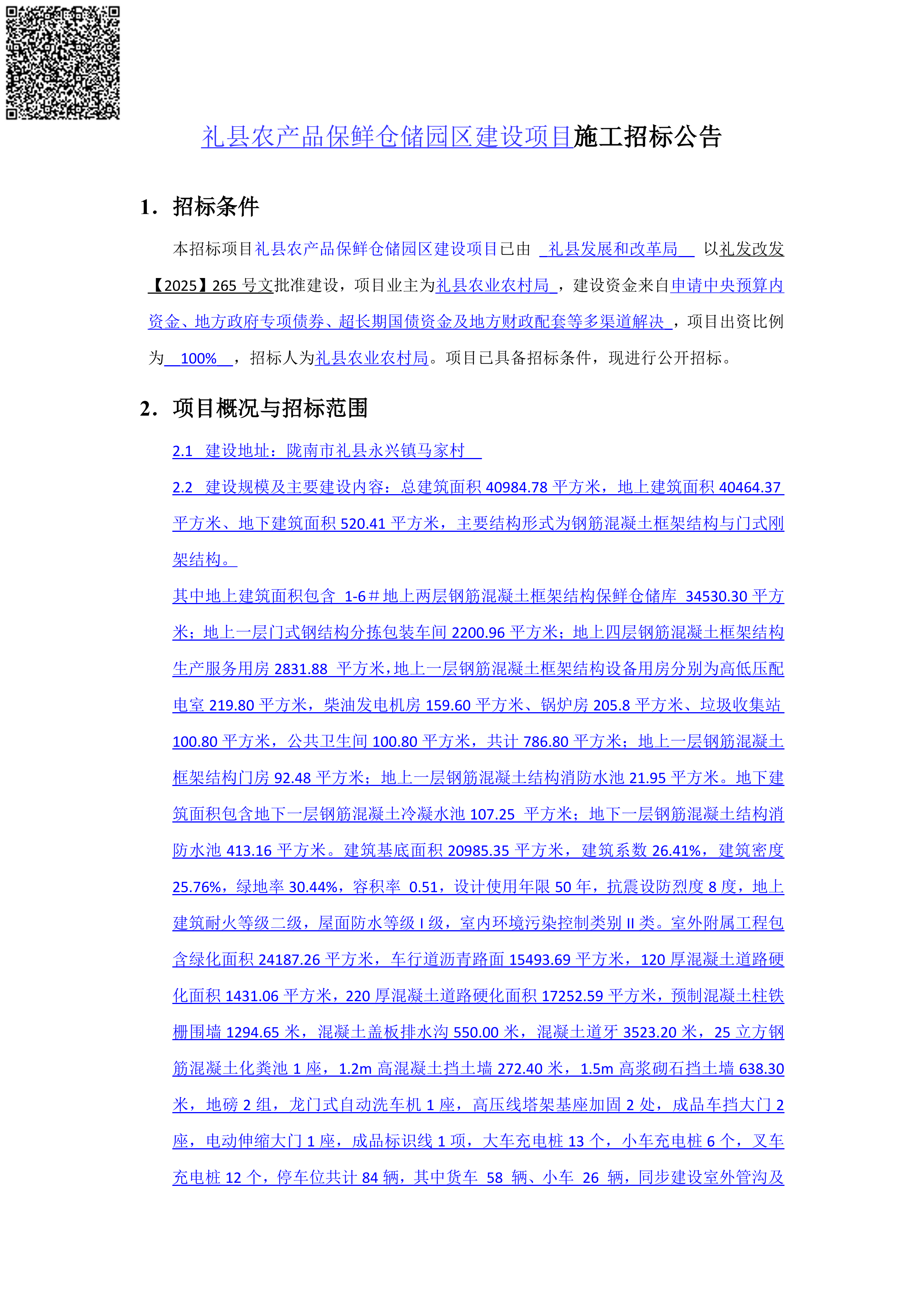 礼县农产品保鲜仓储园区建设项目施工招标公告