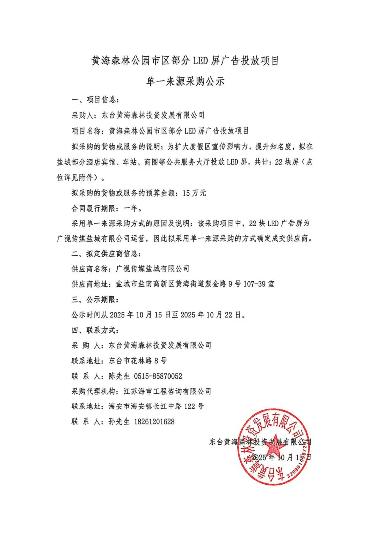 黄海森林公园市区部分LED屏广告投放项目单一来源采购公示