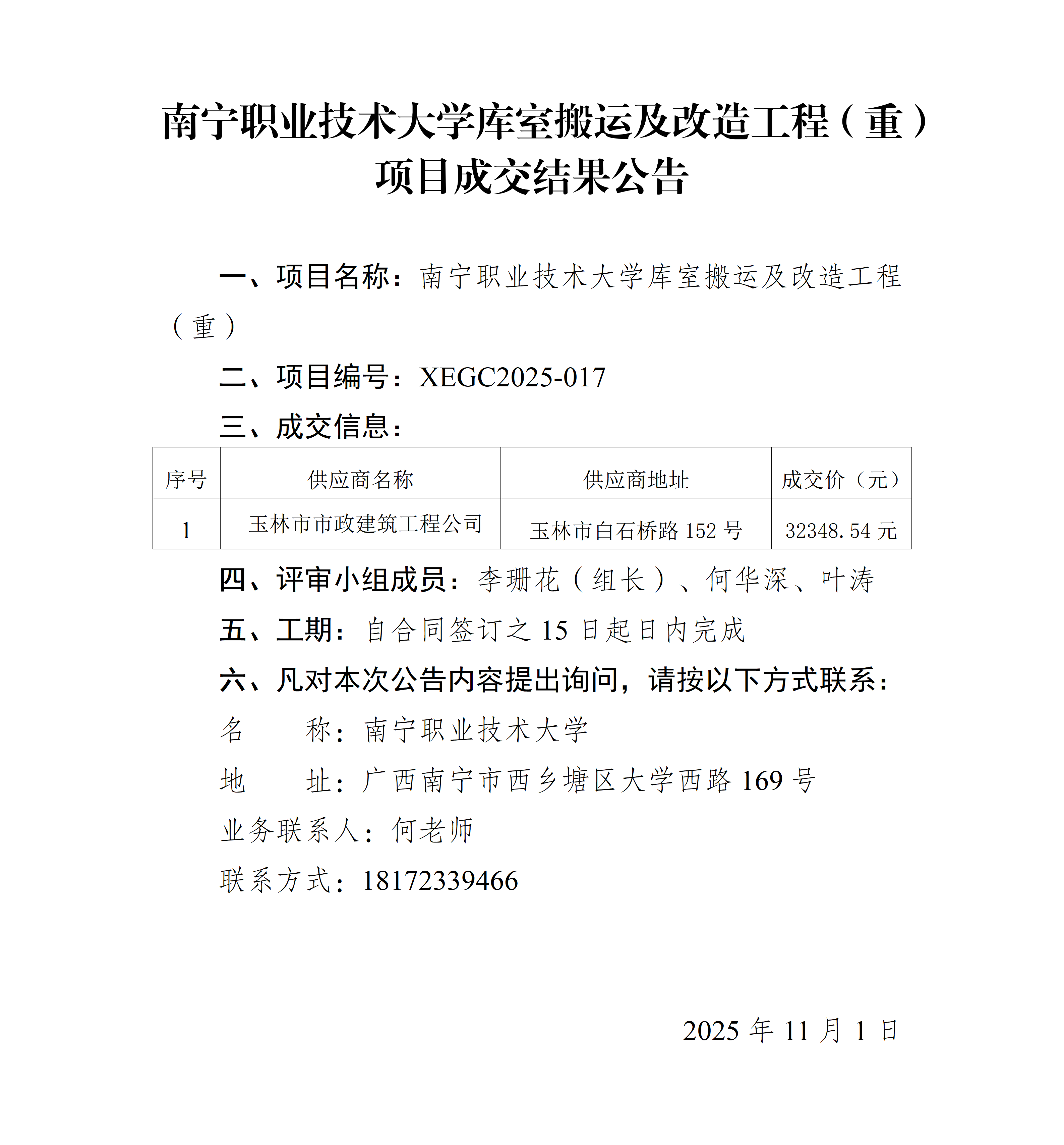 南宁职业技术大学库室搬运及改造工程(重)项目成交结果公告