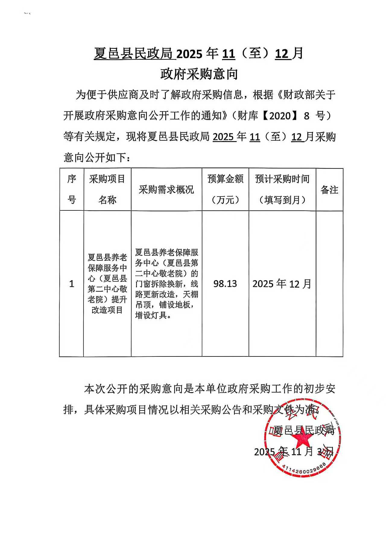 夏邑县民政局2025年11至12月政府采购意向