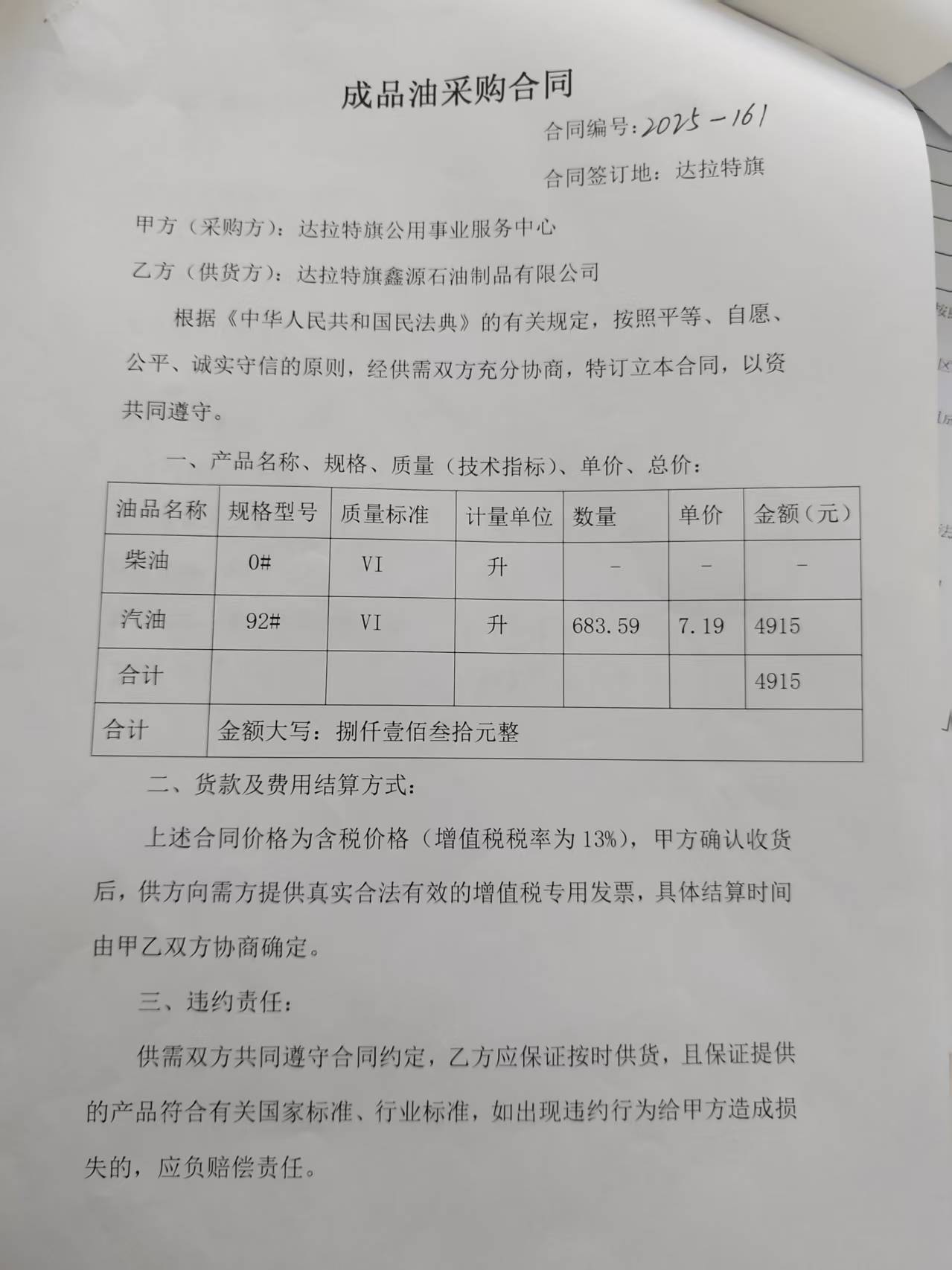 合同金额: *,***.**元,大写(人民币):肆仟玖佰壹拾伍元整 履约期限:****年**月**日至****年**月**日 履约地点:达拉特旗鑫源石油制品有限公司 采购方式: 七、合同签订日期****年**月**日 八、合同公告日期****年**月**日 九、其他补充事宜