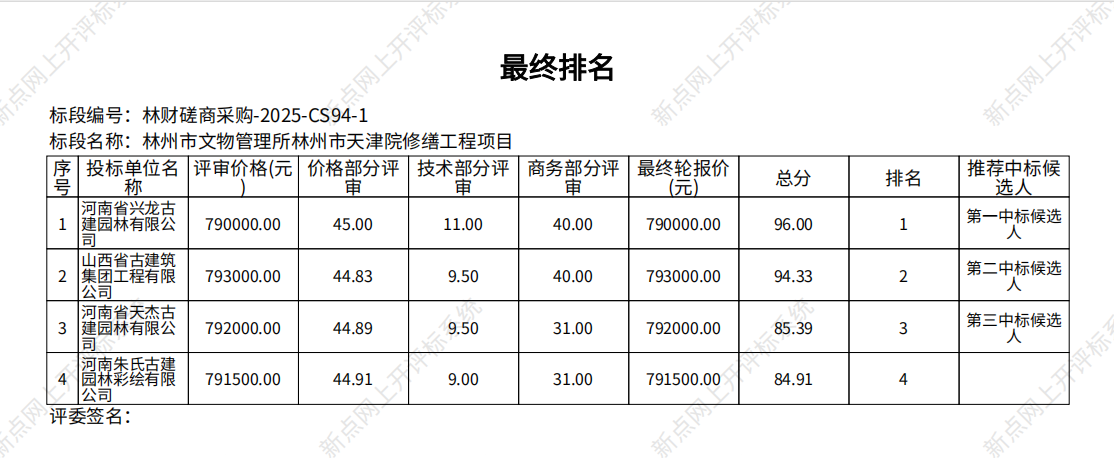 | 评标结果如下: 第一中标候选供应商:河南省兴龙古建园林有限公司技术和商务:**.**分,价格:**.**分,总分:**.**分;第二中标候选供应商:山西省古建筑集团工程有限公司技术和商务:**.**分,价格:**.**分,总分:**.**分;第三中标候选供应商:河南省天杰古建园林有限公司技术和商务:**.**分,价格:**.**分,总分:**.**分;其他中标情况:河南朱氏古建园林彩绘有限公司总分:**.**分;废标情况:无。 各有关当事人对评标结果如有异议者,可以在公告结束之日起七个工作日内,以书面形式向采购人、采购代理机构提出质疑(加盖单位公章且法定代表人签字,并附带相应的证明材料),由法定代表人或其授权代表携带企业营业执照复印件(加盖公章)及授权委托书、本人身份证件(原件)一并提交(邮寄、邮件不予受理),并以质疑函接受确认日期作为受理时间。逾期未提交或未按照要求提交的质疑函将不予受理。 | |||||||||||||||||||||||||||||||