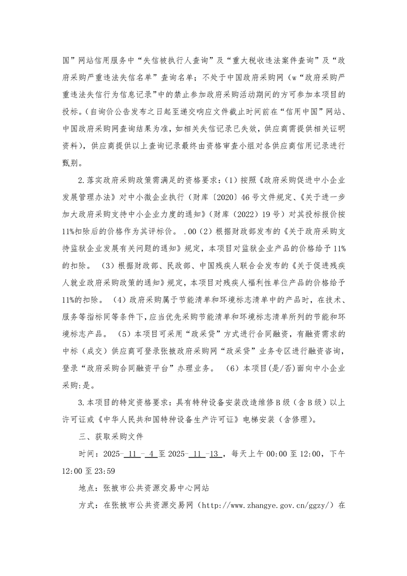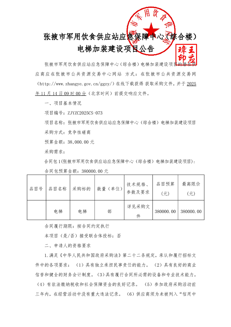 张掖市军用饮食供应站应急保障中心(综合楼)电梯加装建设项目公告采购/资审公告