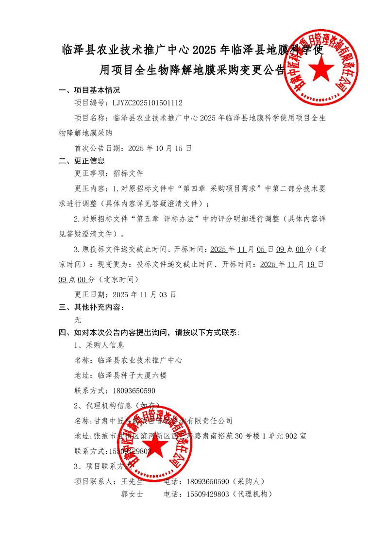 临泽县农业技术推广中心2025年临泽县地膜科学使用项目全生物降解地膜采购变更公告