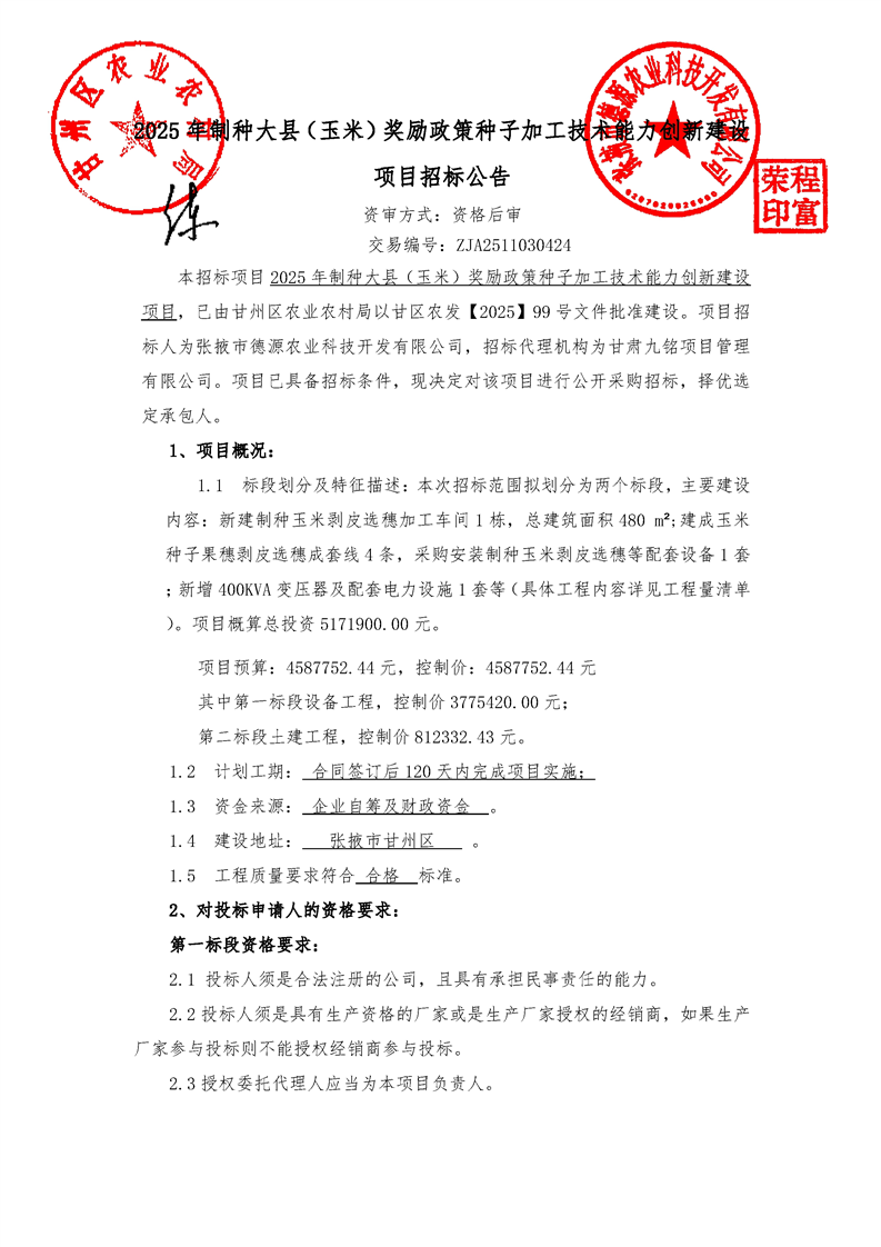 2025年制种大县(玉米)奖励政策种子加工技术能力创新建设项目招标公告