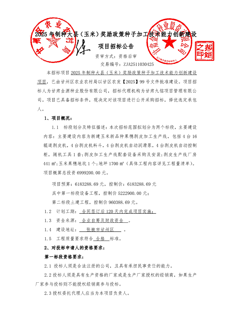 2025年制种大县(玉米)奖励政策种子加工技术能力创新建设项目招标公告