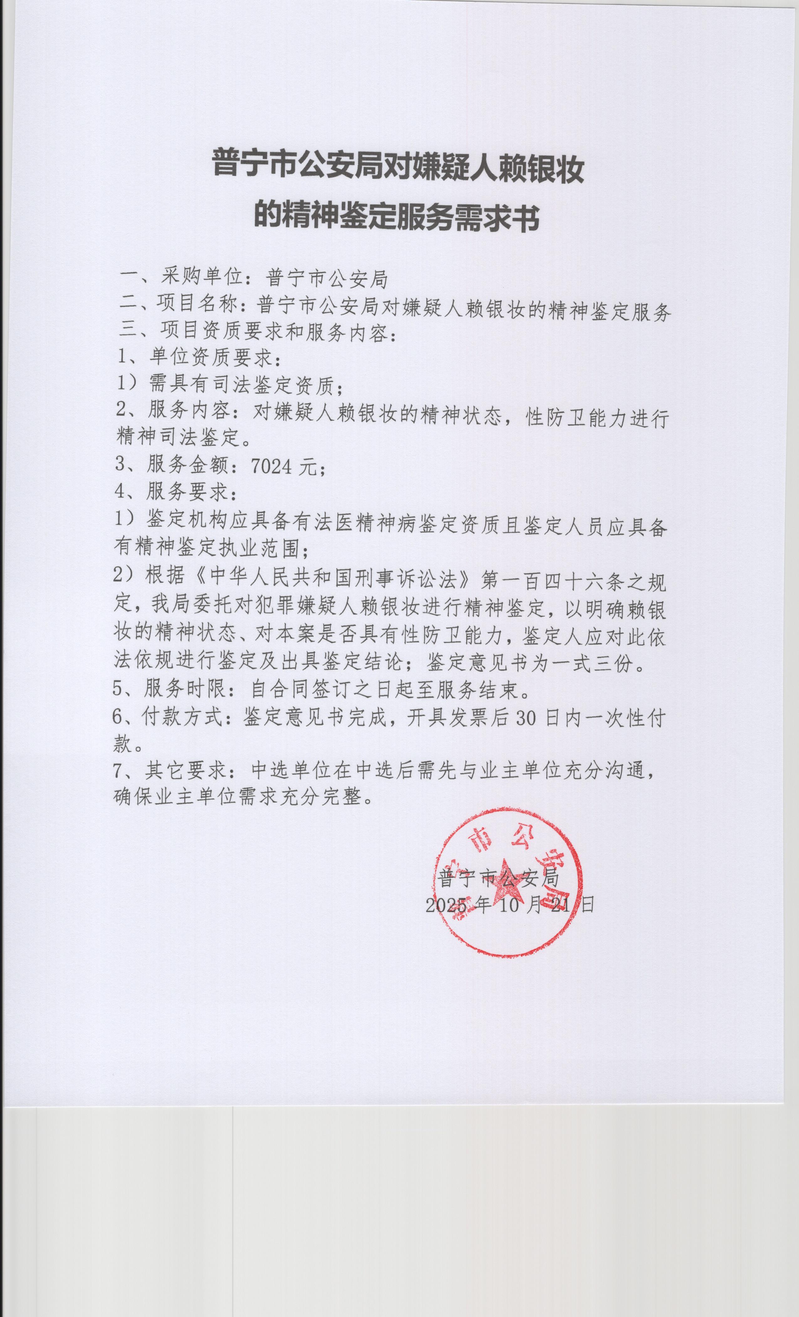 普宁市公安局对嫌疑人赖银妆的精神鉴定服务采购公告