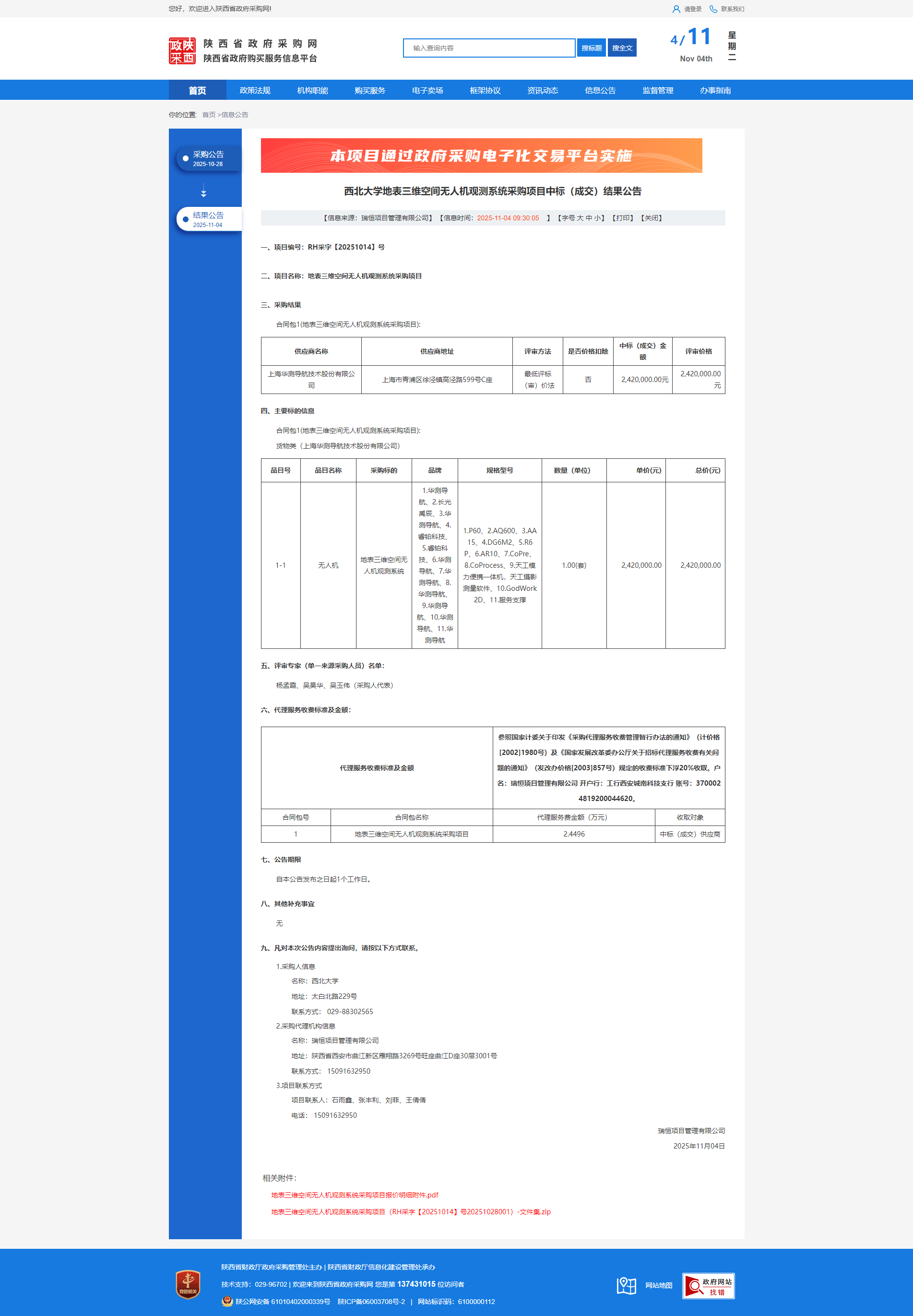 西北大学地表三维空间无人机观测系统采购项目中标(成交)结果公告