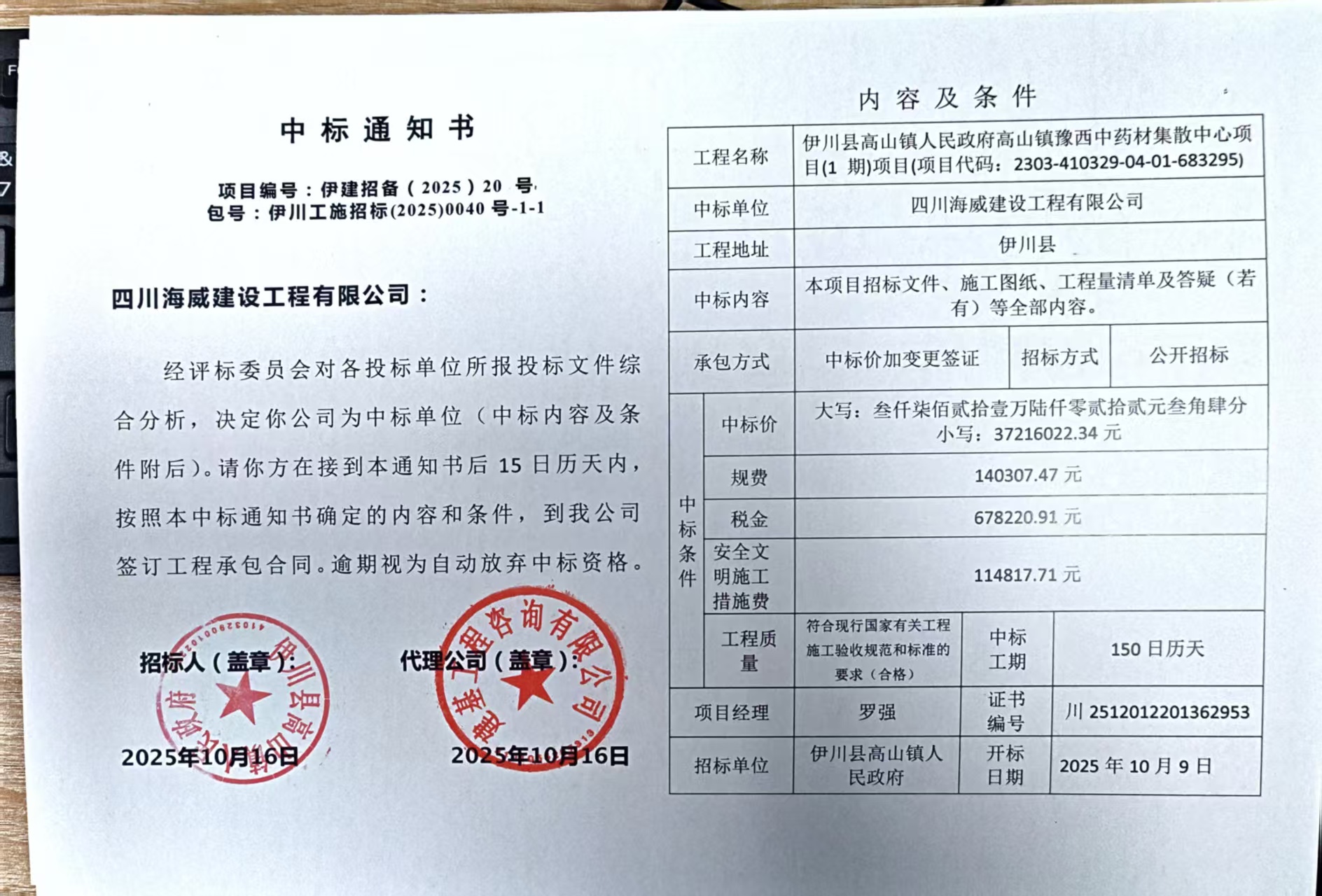 | 二、合同名称:伊川县高山镇人民政府高山镇豫西中药材集散中心项目(一期)项目 | ||||||||||||