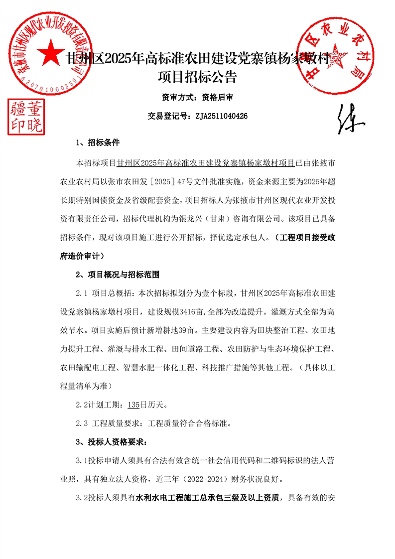 甘州区2025年高标准农田建设党寨镇杨家墩村项目