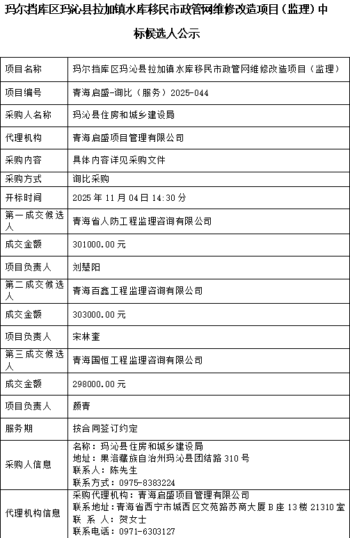 玛尔挡库区玛沁县拉加镇水库移民市政管网维修改造项目(监理)中标候选人公示