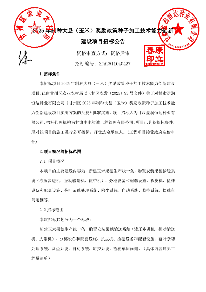 2025年制种大县(玉米)奖励政策种子加工技术能力创新建设项目