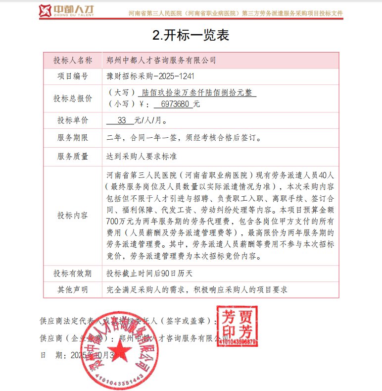 河南省第三人民医院(河南省职业病医院)第三方劳务派遣服务采购项目*中标公告