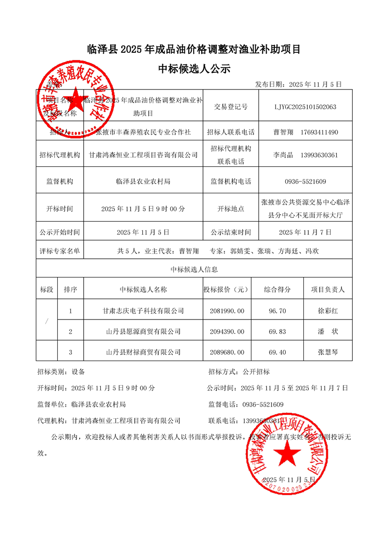 [临泽县]临泽县2025年成品油价格调整对渔业补助项目中标候选人公示交易结果公示