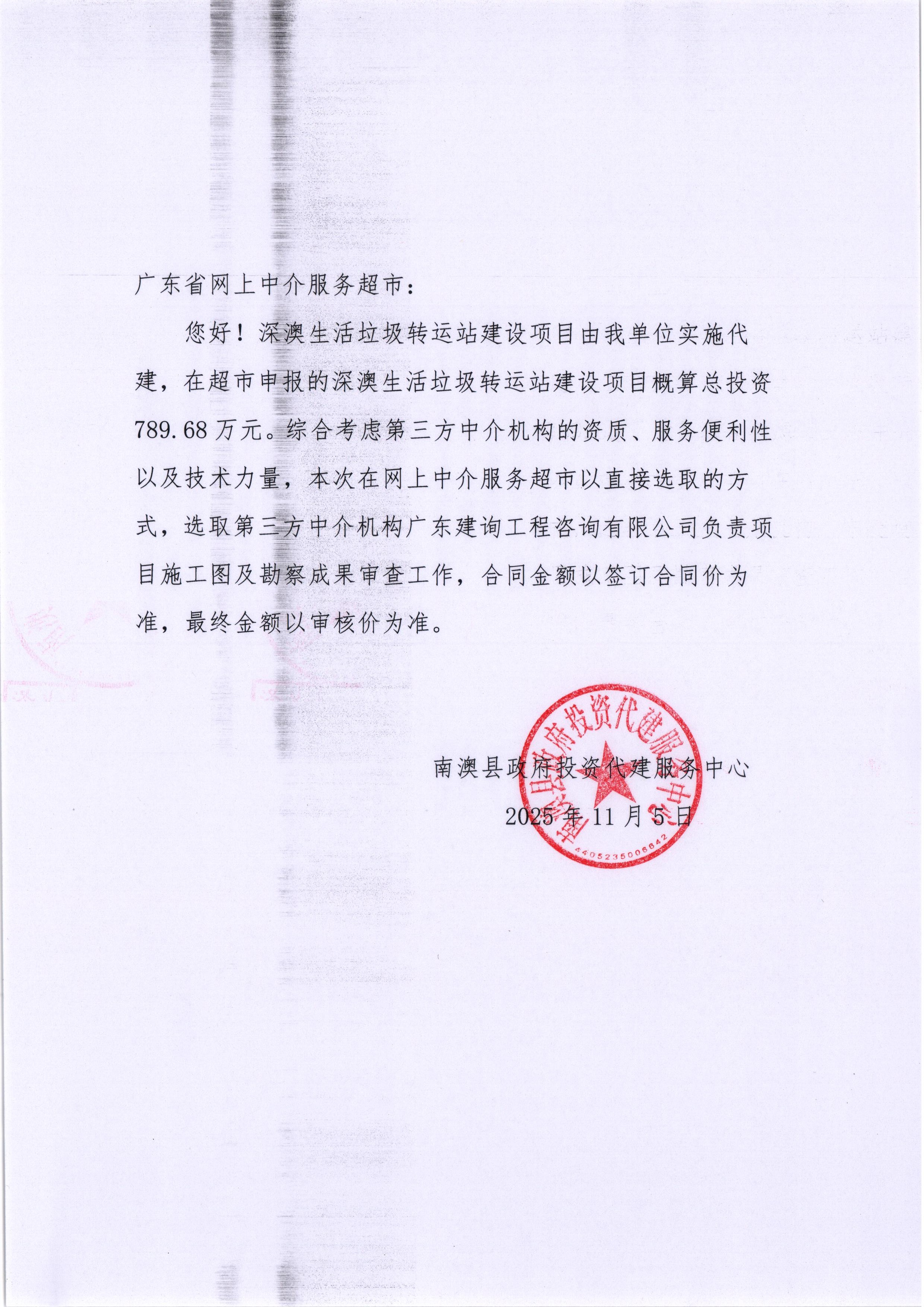 关于【深澳生活垃圾转运站建设项目 施工图及勘察成果审查】中选结果的公告
