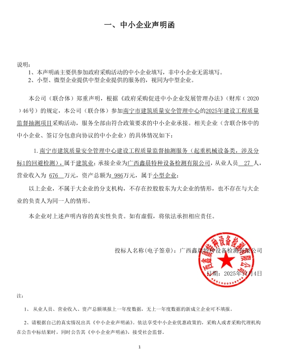 | * | 南宁市建筑质量安全管理中心建设工程质量监督抽测服务(起重机械设备类) | 南宁市建筑质量安全管理中心建设工程质量监督抽测服务(起重机械设备类) | 南宁市建筑质量安全管理中心建设工程质量监督抽测服务(起重机械设备类),详见公开招标文件 | 详见公开招标文件 | 服务期:自合同签订之日起一年。提交服务成果时间:按规范要求及采购人提供的《工程质量监督抽测作业指导书》的时限提供检测报告(抢险、特殊情况与采购人协商确定) | 详见公开招标文件 |