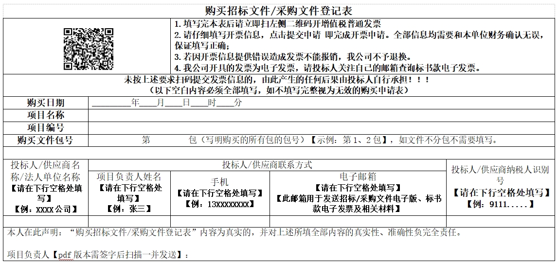 方式:请电汇购买议标文件。议标文件售价为***元人民币,售后不退。有兴趣的供应商可在****年**月*日至****年**月*日期间每个工作日下午**:**(北京时间)前汇款(不接受个人汇款)至采购代理机构指定账户,汇款时请必须注明“*********标书款”。汇款后请将汇款凭证和填写完毕的《购买招标文件/采购文件登记表》(*份可编辑的****版本及*份不可编辑的***版本),同时以电子邮件形式发送至********@***.**.**。采购代理机构工作日当日**:**时前收到邮件的于当日发送议标文件电子版,**:**时后收到的将视为是下一个工作日收到的邮件。
