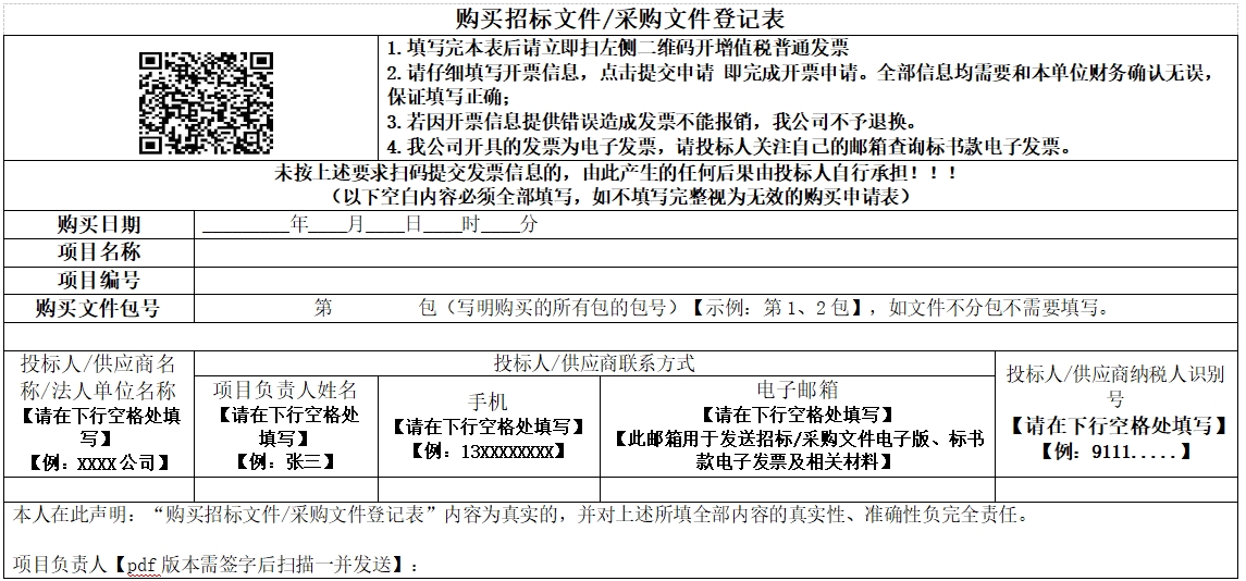 方式:请电汇购买议标文件。议标文件售价为***元人民币,售后不退。有兴趣的供应商可在****年**月*日至****年**月*日期间每个工作日下午**:**(北京时间)前汇款(不接受个人汇款)至采购代理机构指定账户,汇款时请必须注明“*********标书款”。汇款后请将汇款凭证和填写完毕的《购买招标文件/采购文件登记表》(*份可编辑的****版本及*份不可编辑的***版本),同时以电子邮件形式发送至********@***.**.**。采购代理机构工作日当日**:**时前收到邮件的于当日发送议标文件电子版,**:**时后收到的将视为是下一个工作日收到的邮件。