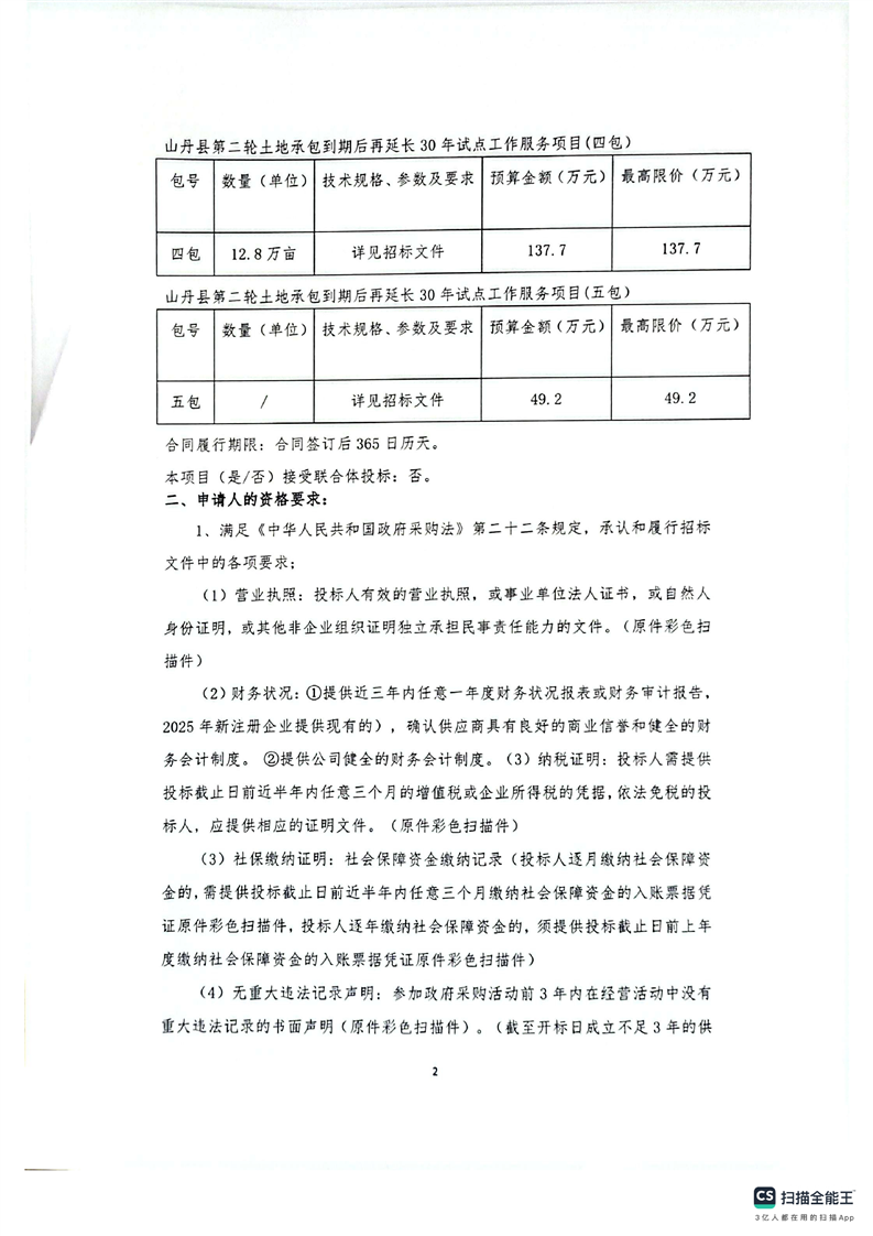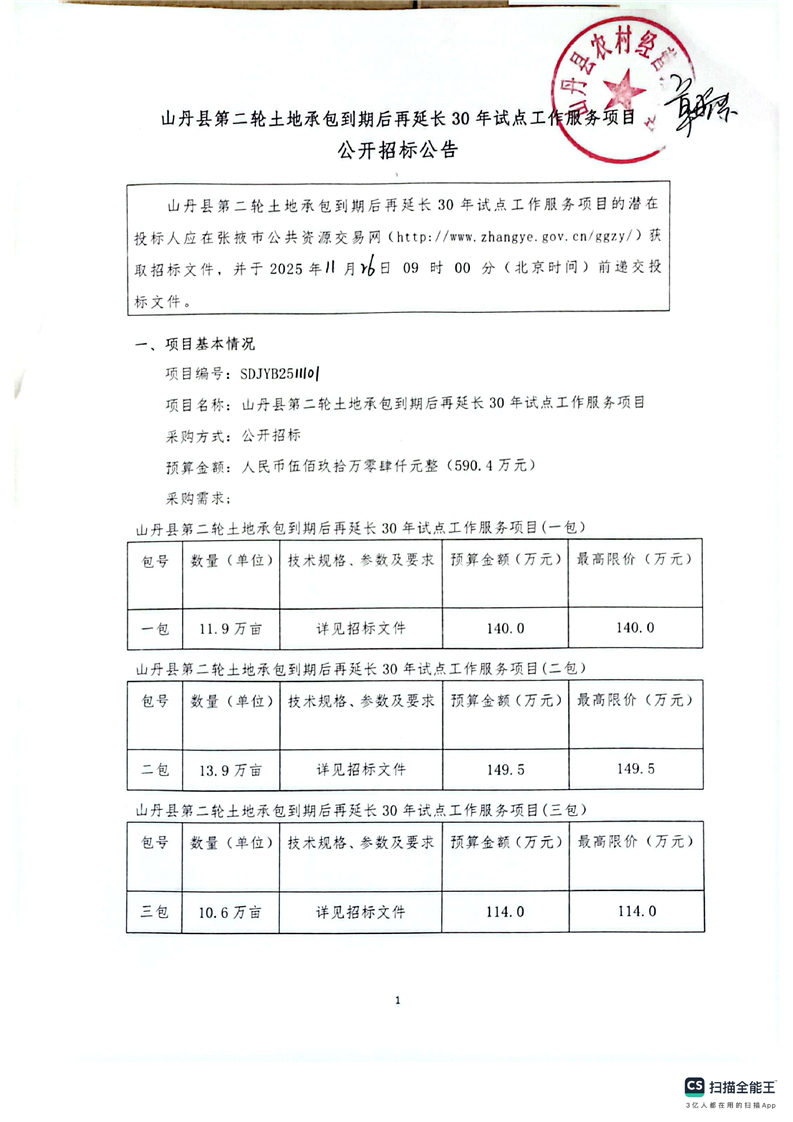 【正常公告】山丹县第二轮土地承包到期后再延长**年试点工作服务项目招标公告