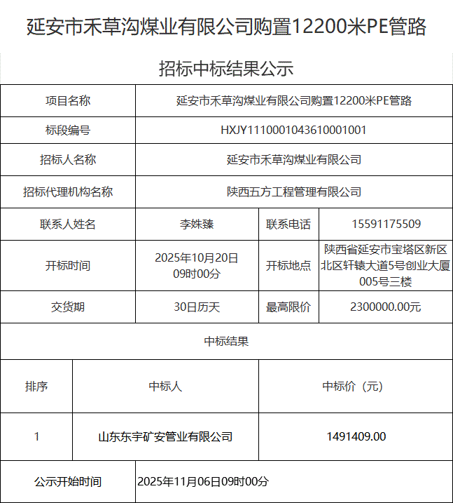 延安市禾草沟煤业有限公司购置12200米PE管路中标结果公示