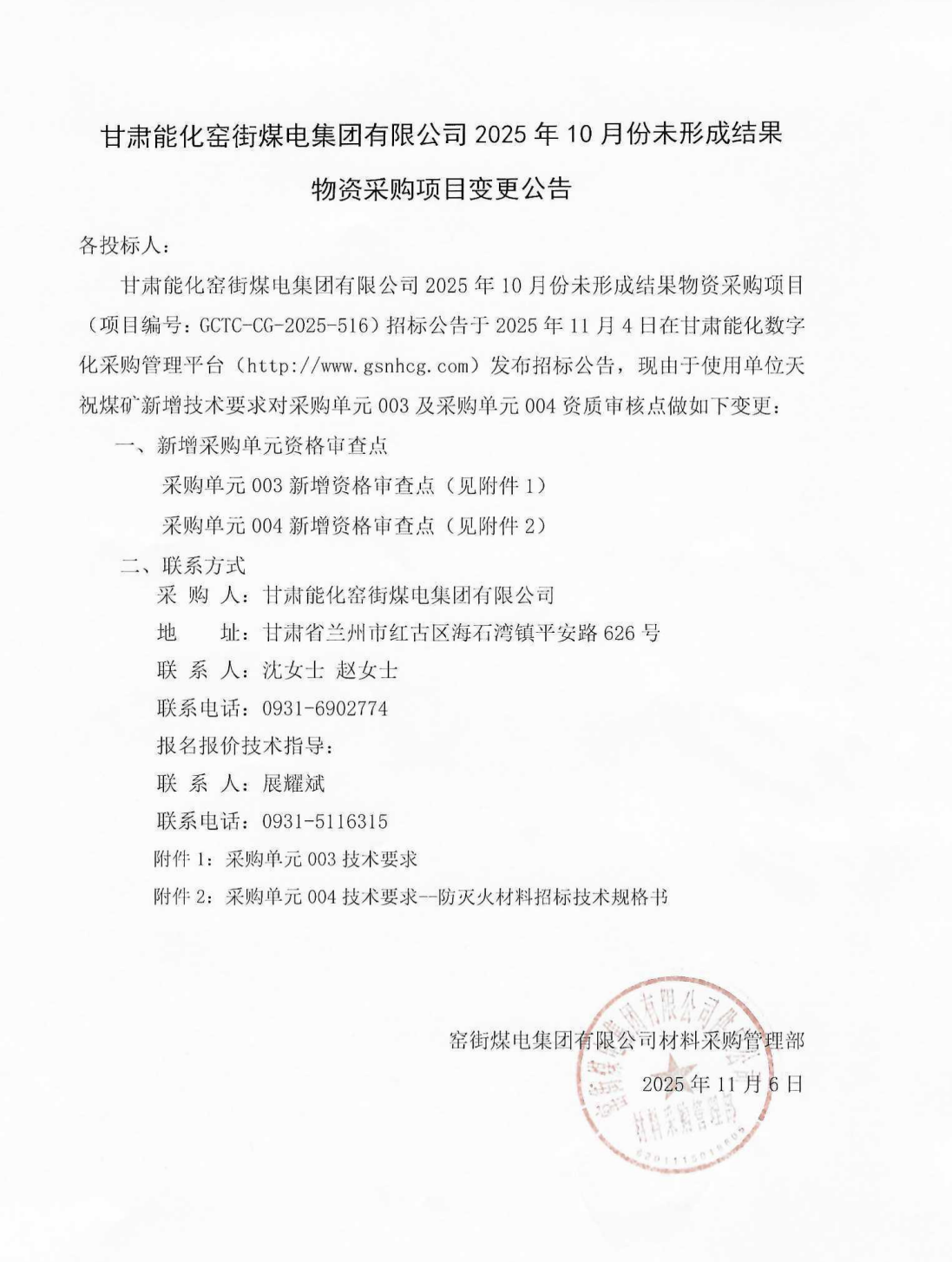 [竞价采购]甘肃能化窑街煤电集团有限公司2025年10月份未形成结果物资采购项目变更公告
