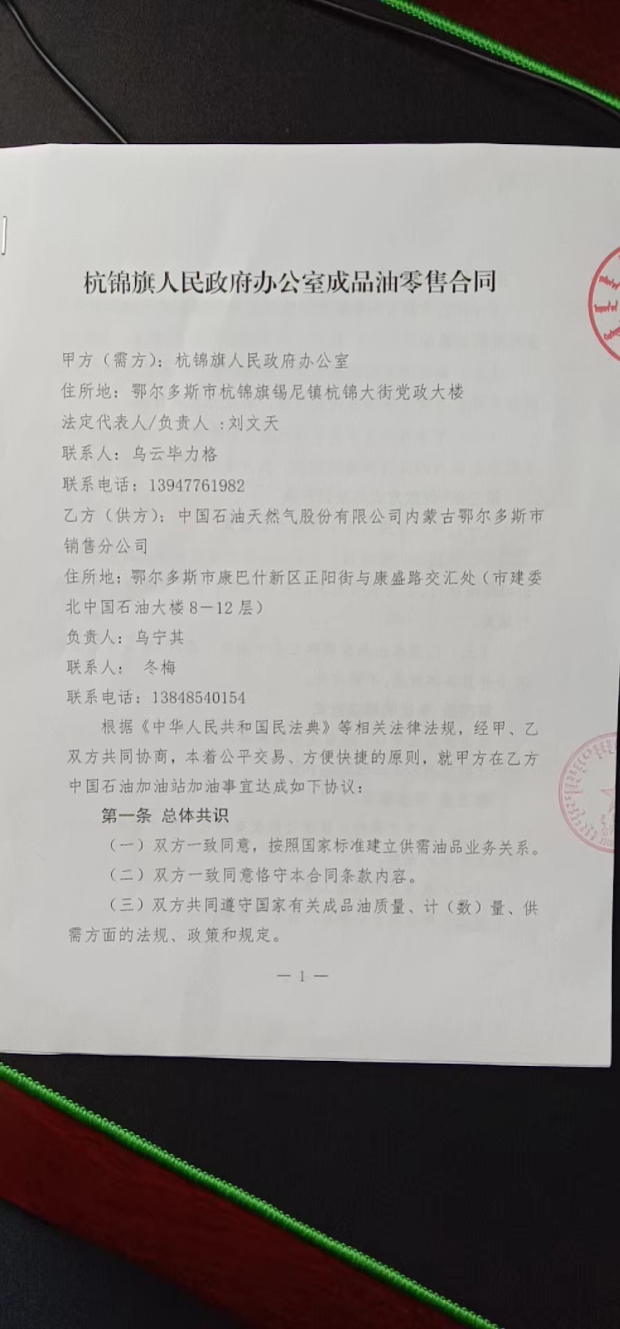 一、合同编号:***************二、合同名称:成品油零售合同三、项目编号:鄂财购备字(电子)[****]*******号四、项目名称:加油服务五、合同主体采购人(甲方):杭锦旗人民政府办公室 地址:锡尼镇 联系方式:*********** 供应商(乙方):中国石油天然气股份有限公司内蒙古鄂尔多斯市销售分公司 地址:内蒙古自治区鄂尔多斯市康巴什区正阳街与康盛路交汇处 联系方式:*********** 六、合同主要信息主要标的: