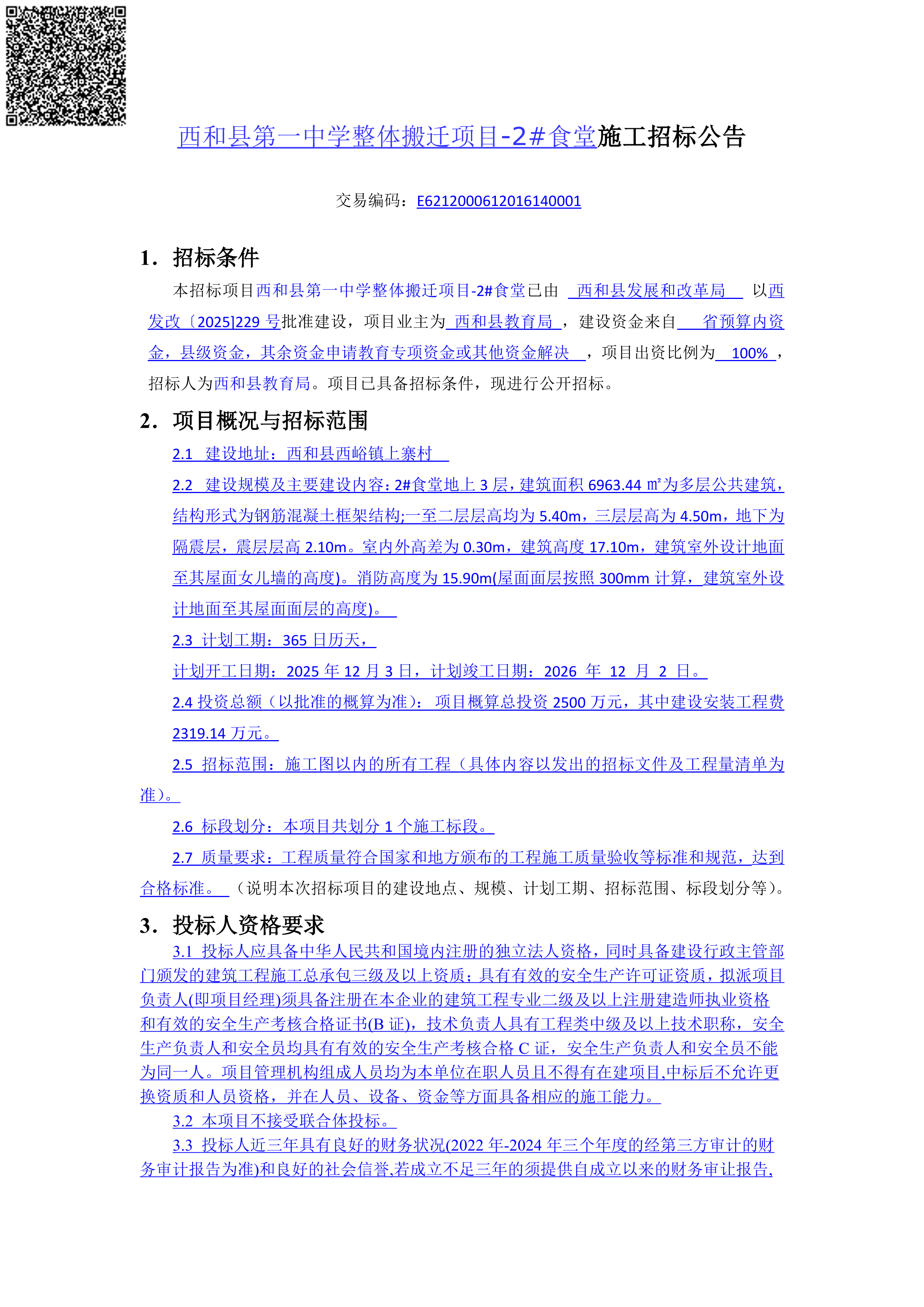 西和县第一中学整体搬迁项目-2#食堂施工招标公告