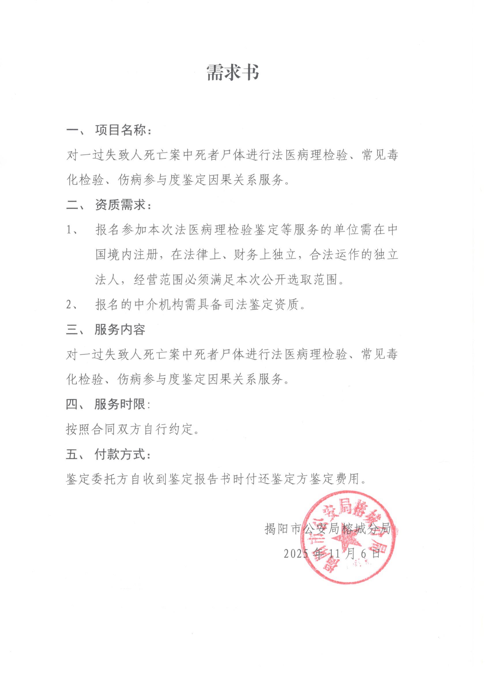 对一过失致人死亡案中死者尸体进行法医病理检验、常见毒化检验、伤病参与度鉴定因果关系服务采购公告