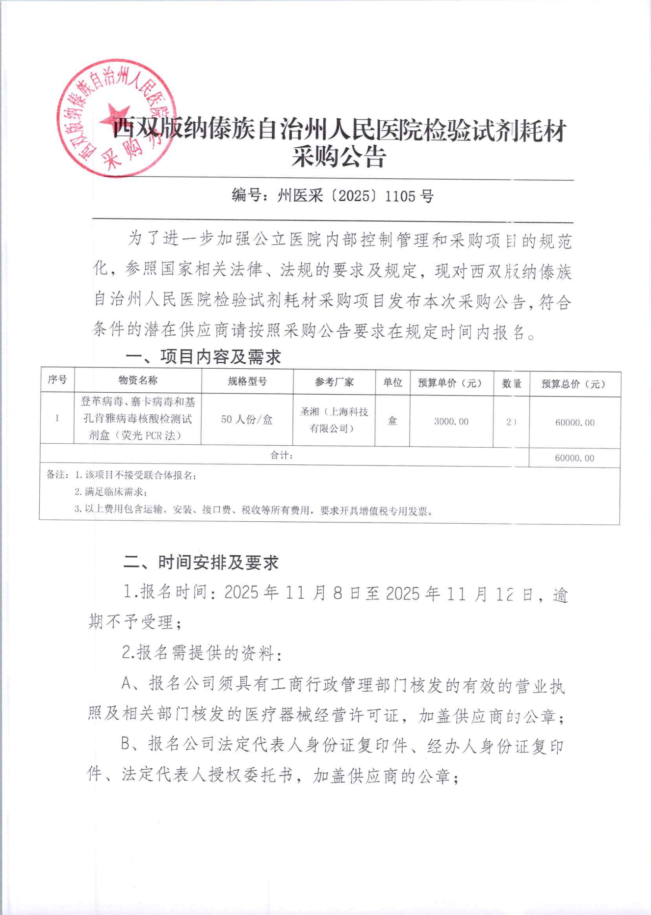 西双版纳傣族自治州人民医院检验试剂耗材采购公告